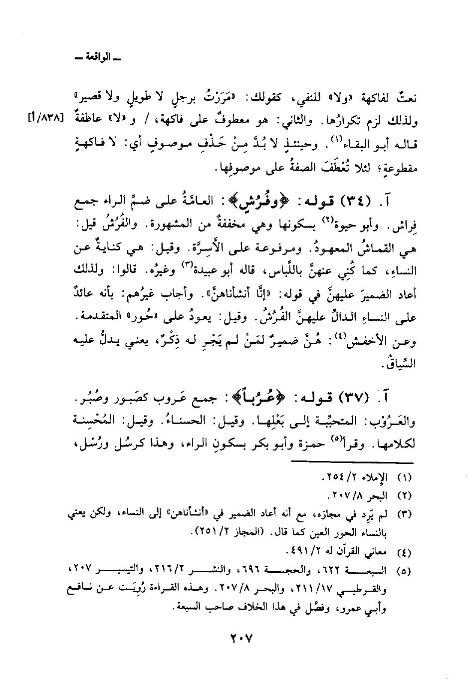 قوله: {وَفُرُشٍ} : العامَّةُ على ضمِّ الراء جمع فِراش. وأبو حيوة بسكونها وهي مخففةٌ من المشهورة. والفُرُشُ قيل: هي القماشُ المعهودُ. ومرفوعة على الأَسِرَّة. وقيل: هي كنايةٌ عن النساءِ، كما كُنِي عنهنَّ باللِّباس، قاله أبو عبيدة وغيرُه. قالوا: ولذلك أعاد الضميرَ عليهنَّ في قوله: «إنَّا أنشأناهنَّ» . وأجاب غيرُهم: بأنه عائدٌ على النساءِ الدالِّ عليهنَّ الفُرُشُ. وقيل: يعودُ على «حُور» المتقدمة. وعن الأخفش: هُنَّ ضميرٌ لمَنْ لم يَجْرِ له ذِكْرٌ، يعني يدلُّ عليه السِّياقُ.