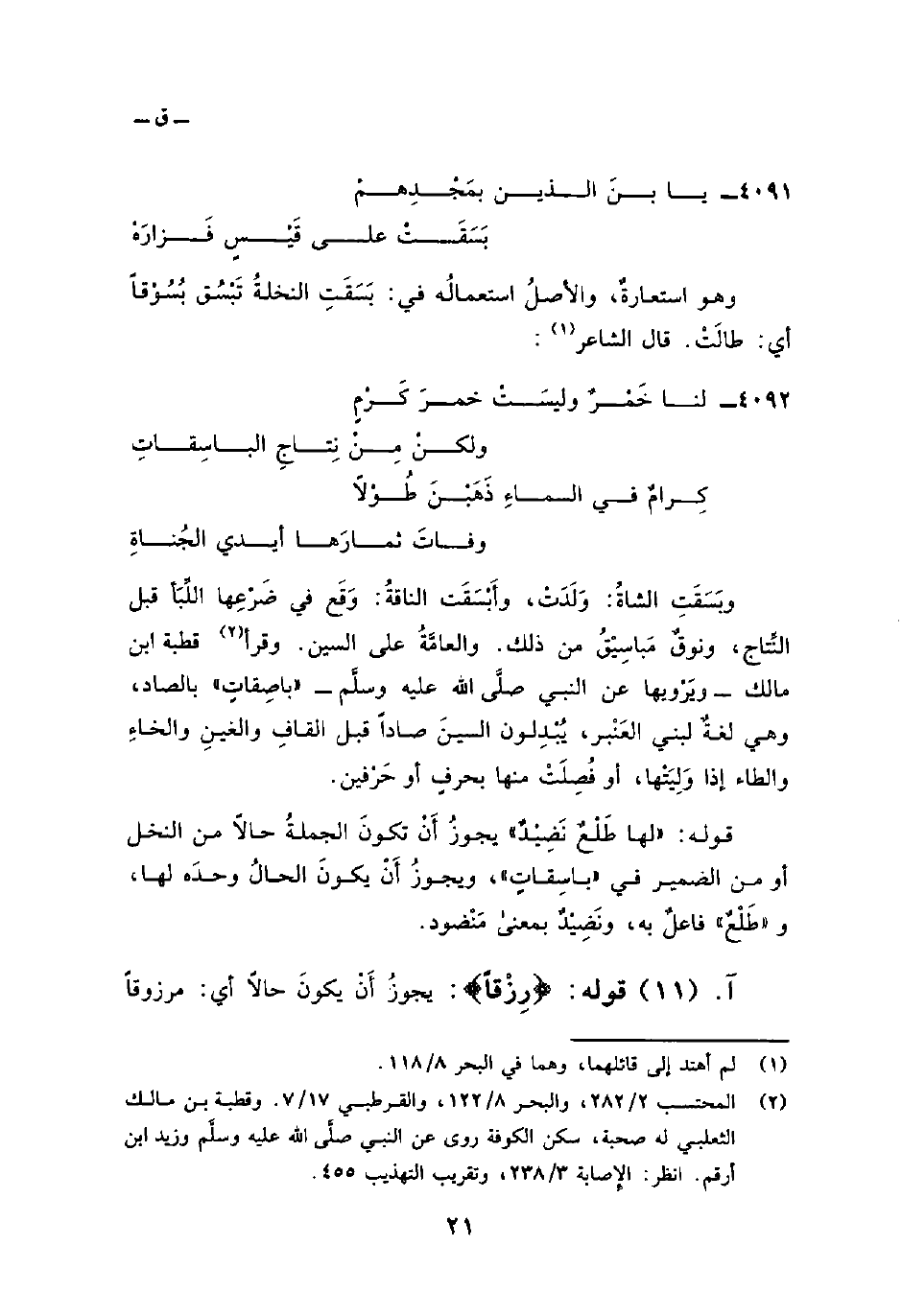 وبَسَقَتِ الشاةُ: وَلَدَتْ، وأَبْسَقَت الناقةُ: وَقَع في ضَرْعِها اللِّبَأ قبل النِّتاج، ونوقٌ مَباسِيْقُ من ذلك. والعامَّةُ على السين. وقرأ قطبة بن مالك ويَرْويها عن النبي صلَّى الله عليه وسلَّم «باصِقاتٍ» بالصاد، وهي لغةٌ لبني العَنْبر، يُبْدِلون السينَ صاداً قبل القافِ والغينِ والخاءِ والطاء إذا وَلِيَتْها، أو فُصِلَتْ منها بحرفٍ أو حَرْفين.
