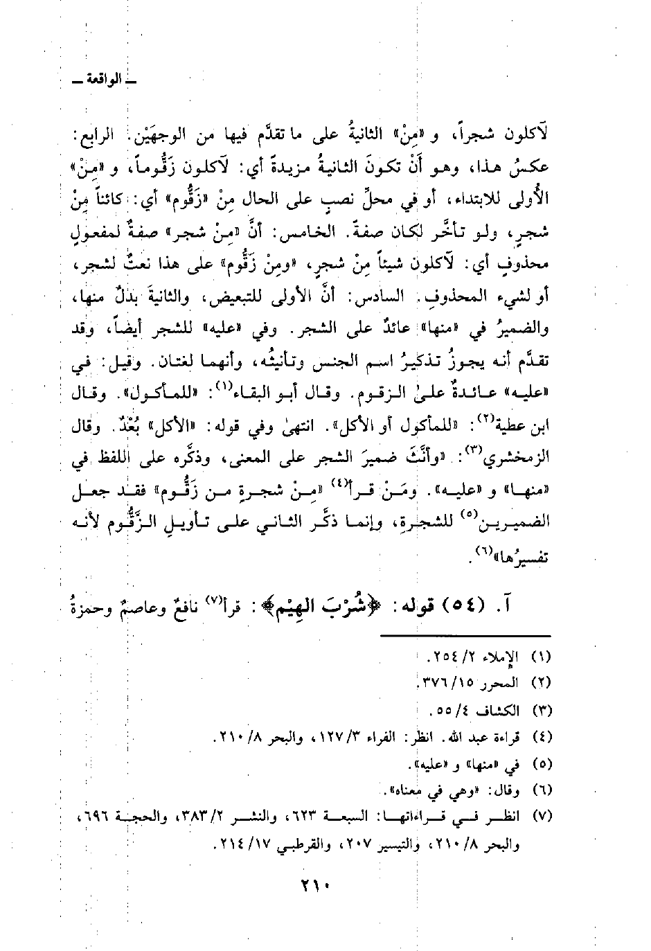 لآكلون شجراً، و «مِنْ» الثانيةُ على ما تقدَّم فيها من الوجهَيْن. الرابع: عكسُ هذا، وهو أَنْ تكونَ الثانيةُ مزيدةً أي: لآكلون زَقُّوماً، و «مِنْ» الأُولى للابتداء، أو في محلِّ نصبٍ على الحال مِنْ «زَقُّوم» أي: كائناً مِنْ شجرٍ، ولو تأخَّر لكان صفةً. الخامس: أنَّ «مِنْ شجر» صفةٌ لمفعولٍ محذوفٍ أي: لآكلون شيئاً مِنْ شجرٍ، «ومِنْ زَقُّوم» على هذا نعتٌ لشجر، أو لشيء المحذوفِ. السادس: أنَّ الأولى للتبعيض، والثانيةَ بدلٌ منها، والضميرُ في «منها» عائدٌ على الشجر. وفي «عليه» للشجر أيضاً، وقد تقدَّم أنه يجوزُ تذكيرُ اسم الجنس وتأنيثُه، وأنهما لغتان. وقيل: في «عليه» عائدةٌ على الزقوم. وقال أبو البقاء: «للمأكول» . وقال ابن عطية: «للمأكول أو الأكل» . انتهى وفي قوله: «الأكل» بُعْدٌ. وقال الزمخشري: «وأنَّثَ ضميرَ الشجر على المعنى، وذكَّره على اللفظ في» منها «و» عليه «. ومَنْ قرأ {مِن شَجَرٍ مِّن زَقُّومٍ} فقد جعل الضميرين للشجرةِ، وإنما ذكَّر الثاني على تأويلِ الزَّقُّوم لأنه تفسيرُها» .
