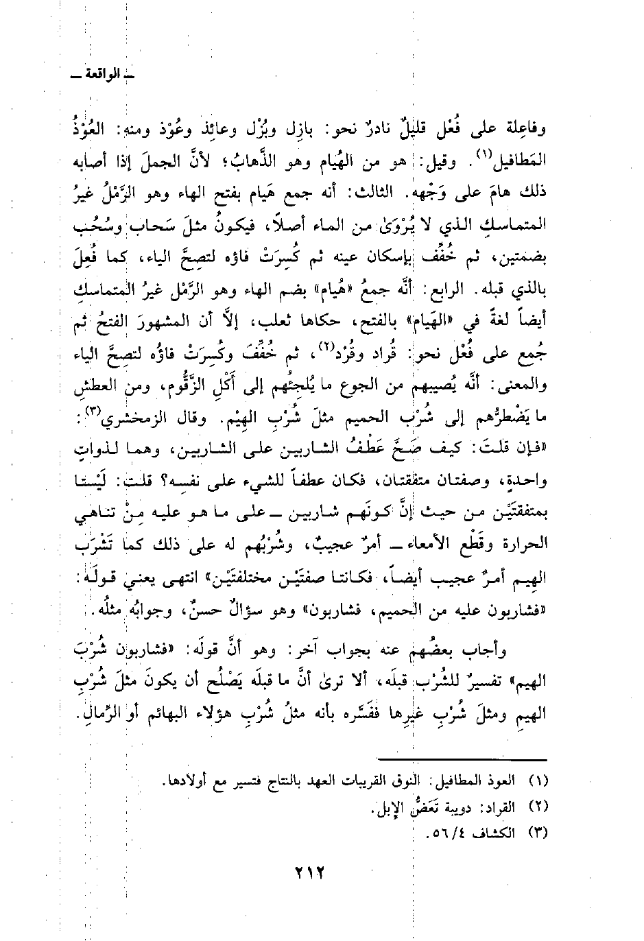 وفاعِلة على فُعْل قليلٌ نادرٌ نحو: بازِل وبُزْل وعائِذ وعُوْذ ومنه: العُوْذُ المَطافيل. وقيل: هو من الهُيام وهو الذَّهابُ؛ لأنَّ الجملَ إذا أصابه ذلك هامَ على وَجْهه. الثالث: أنه جمع هَيام بفتح الهاء وهو الرَّمْلُ غيرُ المتماسكِ الذي لا يُرْوَى من الماء أصلاً، فيكونُ مثلَ سَحاب وسُحُب بضمتين، ثم خُفِّف بإسكان عينه ثم كُسِرَتْ فاؤه لتصِحَّ الياء، كما فُعِلَ بالذي قبله. الرابع: أنَّه جمعُ «هُيام» بضم الهاء وهو الرَّمْل غيرُ المتماسكِ أيضاً لغةً في «الهَيام» بالفتح، حكاها ثعلب، إلاَّ أن المشهورَ الفتحُ ثم جُمع على فُعْل نحو: قُراد وقُرْد، ثم خُفِّفَ وكُسِرَتْ فاؤُه لتصِحَّ الياء والمعنى: أنَّه يُصيبهم من الجوع ما يُلجِئُهم إلى أَكْلِ الزَّقُّوم، ومن العطشِ ما يَضْطرُّهم إلى شُرْب الحميم مثلَ شُرْبِ الهِيْم. وقال الزمخشري: «فإن قلتَ: كيف صَحَّ عَطْفُ الشاربين على الشاربين، وهما لذواتٍ واحدةٍ، وصفتان متفقتان، فكان عطفاً للشيء على نفسِه؟ قلت: لَيْستا بمتفقتَيْن من حيث إنَّ كونَهم شاربين على ما هو عليه مِنْ تناهي الحرارة وقَطْع الأمعاء أمرٌ عجيبٌ، وشُرْبُهم له على ذلك كما تَشْرَب الهِيم أمرٌ عجيب أيضاً، فكانتا صفتَيْن مختلفتَيْن» انتهى يعنى قولَه: «فشاربون عليه من الحميم، فشاربون» وهو سؤالٌ حسنٌ، وجوابُه مثلُه.