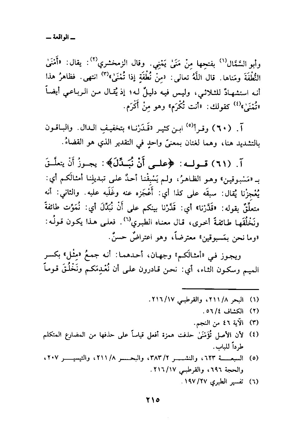 قوله: {على أَن نُّبَدِّلَ} : يجوزُ أَنْ يتعلَّقَ ب «مَسْبوقين» وهو الظاهرُ، ولم يَسْبِقْنا أحدٌ على تبديلِنا أمثالَكم أي: يُعْجِزْنا يُقال: سبقَه على كذا أي: أَعْجَزه عنه وغَلَبه عليه. والثاني: أنه متعلِّقٌ بقوله: «قَدَّرنا» أي: قَدَّرْنا بينكم على أَنْ نُبَدِّلَ أي: نُمَوِّت طائفةً ونَخْلُقَها طائفةً أخرى، قال معناه الطبري. فعلى هذا يكون قولُه: {وَمَا نَحْنُ بِمَسْبُوقِينَ} معترضاً، وهو اعتراضٌ حسنٌ.