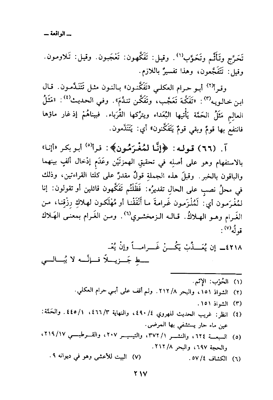 وقرأ أبو حرام العكلي «تَفَكَّنون» بالنون مثل تَتَنَدَّمون. قال ابن خالويه: «تَفَكَّهَ تَعَجَّب، وتَفَكَّن تندَّمَ» . وفي الحديث: «مَثَلُ العالِمِ مَثَلُ الحَمَّة يَأْتيها البُعَداء ويترُكها القُرَباء. فبيناهُمْ إذ غار ماؤها فانتفع بها قومٌ وبقي قومٌ يَتَفَكَّنون» أي: يَتَنَدَّمون.