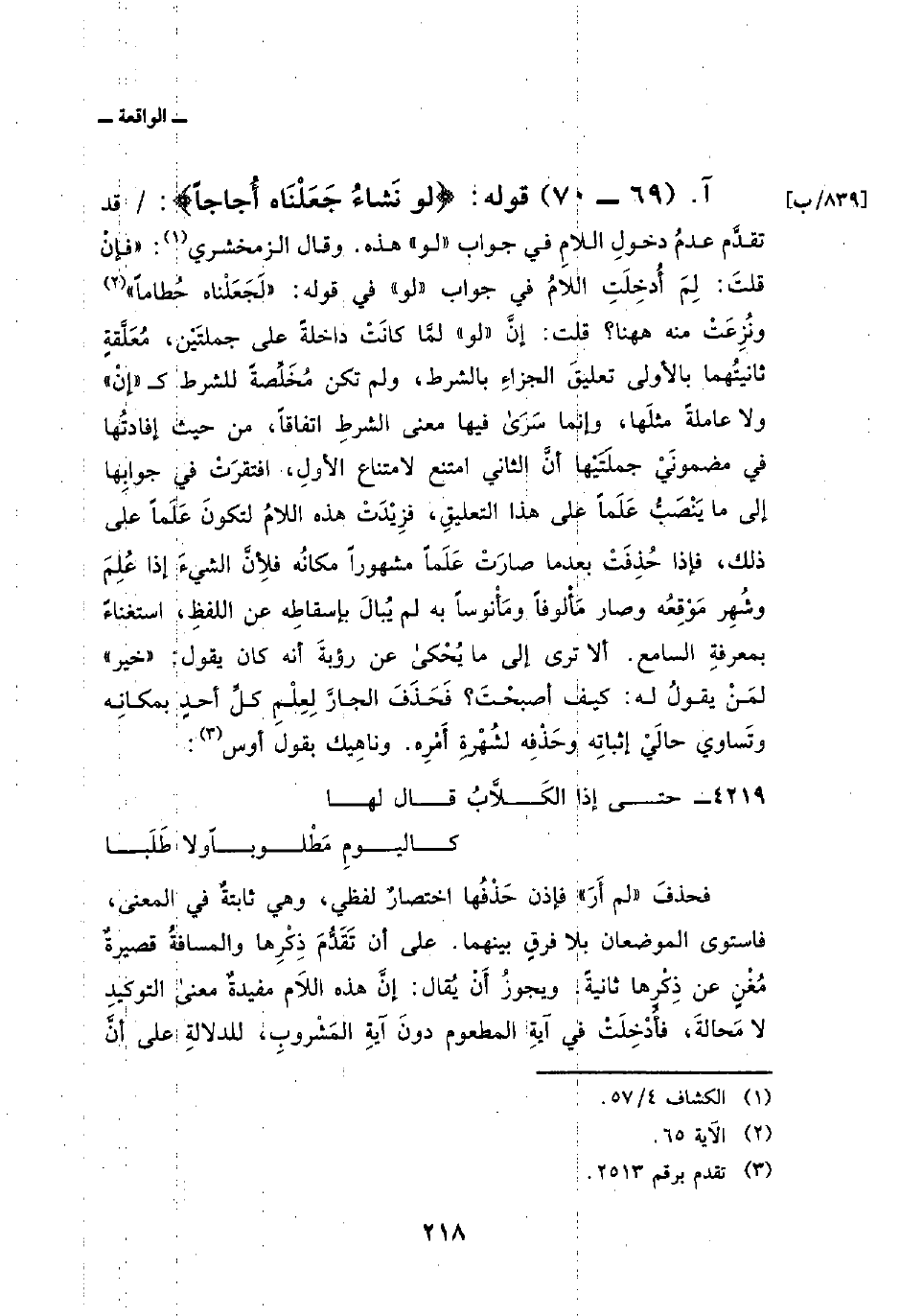 قوله: {لَوْ نَشَآءُ جَعَلْنَاهُ أُجَاجاً} : / قد تقدَّم عدمُ دخولِ اللامِ في جواب «لو» هذه. وقال الزمشخري: «فإن قلتَ: لِمَ أُُدخِلَتِ اللامُ في جواب» لو «في قوله: {لَجَعَلْنَاهُ حُطَاماً} [الواقعة: 65] ونُزِعَتْ منه ههنا؟ قلت: إنَّ» لو «لمَّا كانَتْ داخلةً على جملتَيْن، مُعَلَّقةٍ ثانيتُهما بالأولى تعليقَ الجزاءِ بالشرط، ولم تكن مُخَلِّصةً للشرط ك» إنْ «ولا عاملةً مثلَها، وإنما سَرَى فيها معنى الشرطِ اتفاقاً، من حيث إفادتُها في مضومونَيْ جملَتَيْها أنَّ الثاني امتنع لامتناع الأولِ، افتقرَتْ في جوابِها إلى ما يَنْصَبُّ عَلَماً على هذا التعليقِ، فزِيْدَتْ هذه اللامُ لتكونَ عَلَماً على ذلك، فإذا حُذِفَتْ بعدما صارَتْ عَلَماً مشهوراً مكانُه فلأِنَّ الشيءَ إذا عُلِمَ وشُهِر مَوْقِعُه وصار مَأْلوفاً ومَأْنوساً به لم يُبالَ بإسقاطِه عن اللفظِ، استغناءً بمعرفةِ السامع. ألا ترى إلى ما يُحْكى عن رؤبةَ أنه كان يقول:» خير «لمَنْ يقولُ له: كيف أصبحْتَ؟ فَحَذَفَ الجارَّ لِعِلْمِ كلِّ أحدٍ بمكانِه وتَساوي حالَيْ إثباتِه وحَذْفِه لشُهْرةِ أَمْرِه. وناهِيك بقولَ أوس: