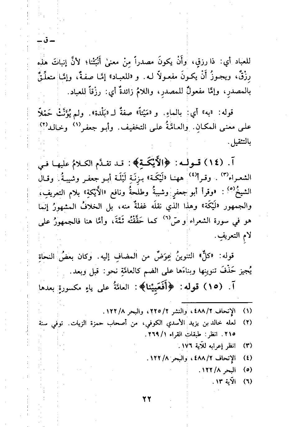 قوله: {الأيكة} : قد تقدَّم الكلامُ عليها في الشعراء. وقرأ ههنا «لَيْكَة» بزِنَةِ لَيْلَة أبو جعفر وشيبةٌ. وقال الشيخُ: «وقرأ أبو جعفرٍ وشيبةُ وطلحةُ ونافع» الأَيْكةِ «بلام التعريفِ، والجمهور» لَيْكَة «وهذا الذي نقلَه غفلةٌ منه، بل الخلافُ المشهورُ إنما هو في سورة الشعراء وص كما حَقَّقْتُه ثَمَّةَ، وأمَّا هنا فالجمهورُ على لامِ التعريفِ.