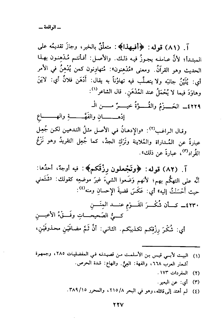 قوله: {أفبهذا} : متعلِّقٌ بالخبر، وجازَ تقديمُه على المبتدأ؛ لأنَّ عامله يجوزُ فيه ذلك. والأصل: أفأنتم مُدْهِنون بهذا الحديث وهو القرآنُ. ومعنى «مُدْهِنون» : مُتهاوِنون كمن يُدْهِنُ في الأمر أي: يُلَيِّنُ جانبَه ولا يتصلَّب فيه تهاوُناً به يقال: أَدْهَن فلانٌ أي: لايَنَ وهاوَدَ فيما لا يُحْمَلُ عند المُدْهَنِ. قال الشاعر: