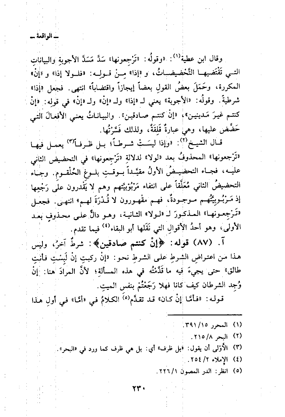 وقال ابن عطية: «وقولُه:» تَرْجِعونها «سَدَّ مَسَدَّ الأجوبةِ والبياناتِ التي تَقْتَضيها التَّحْضيضاتُ، و» إذا «مِنْ قولِه:» فلولا إذا «و» إنْ «المكررة، وحَمَلَ بعضُ القولِ بعضاً إيجازاً» واقتضاباً «انتهى. فجعل» إذا «شرطيةً. وقولُه:» الأجوبة «يعني ل» إذا «ول» إنْ «ول» إنْ «في قولِه: {إِن كُنتُمْ غَيْرَ مَدِينِينَ} ، {إِنْ كُنْتُمْ صَادِقِينَ} . والبياناتُ يعني الأفعالَ التي حَضَّض عليها، وهي عبارةٌ قَلِقَةٌ، ولذلك فَسَّرْتُها.