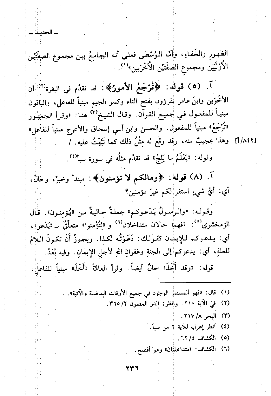 قوله: {تُرْجَعُ الأمور} : قد تقدَّم في البقرة أن الأخَوَين وابنَ عامر يقرؤون بفتح التاء وكسر الجيم مبنياً للفاعل، والباقون مبنياً للمفعول في جميع القرآن. وقال الشيخ هنا: «وقرأ الجمهور» تُرْجَعُ «مبنياً للمفعول. والحسن وابن أبي إسحاق والأعرج مبنياً للفاعل» وهذا عجيبٌ منه، وقد وقع له مِثْلُ ذلك كما نَبَّهْتُ عليه. /