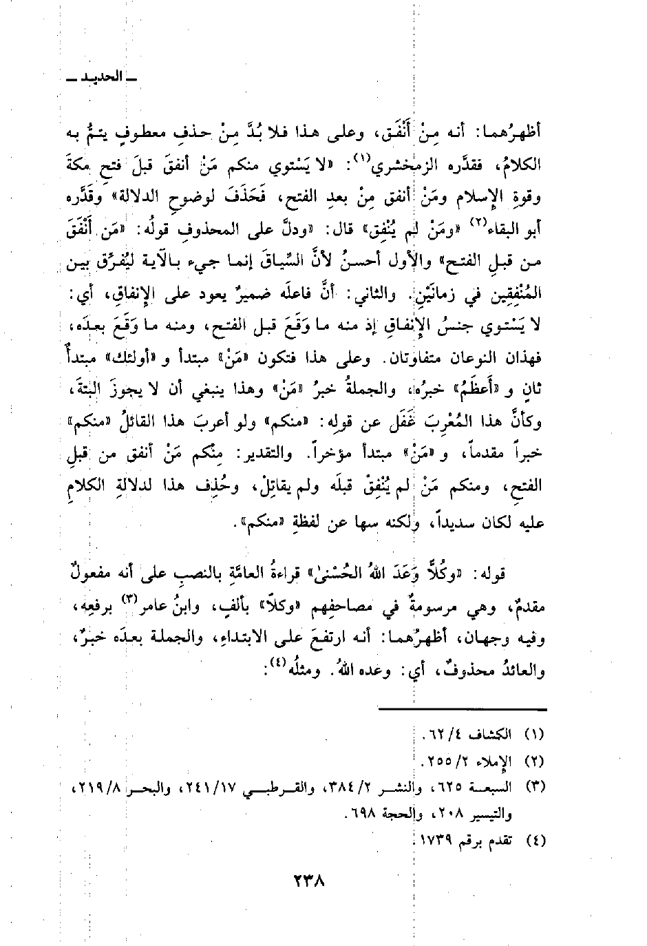 أظهرُهما: أنه مِنْ أَنْفَق، وعلى هذا فلا بُدَّ مِنْ حذفِ معطوفٍ يتمُّ به الكلامُ، فقدَّره الزمخشري: «لا يَسْتوي منكم مَنْ أنفقَ قبلَ فتحِ مكةَ وقوةِ الإِسلام ومَنْ أنفق مِنْ بعدِ الفتح، فَحَذَفَ لوضوحِ الدلالة» وقَدَّره أبو البقاء «ومَنْ لم يُنْفِق» قال: «ودلَّ على المحذوفِ قولُه: {مَّنْ أَنفَقَ مِن قَبْلِ الفتح} والأول أحسنُ لأنَّ السِّيَاقَ إنما جيء بالآية ليُفرِّق بين المُنْفِقين في زمانَيْنِ. والثاني: أنَّ فاعلَه ضميرٌ يعود على الإِنفاقِ، أي: لا يَسْتوي جنسُ الإِنفاقِ إذ منه ما وَقَعَ قبل الفتح، ومنه ما وَقَعَ بعدَه، فهذان النوعان متفاوتان. وعلى هذا فتكون» مَنْ «مبتدأ و» أولئك «مبتدأٌ ثانٍ و» أَعظَمُ «خبرُه، والجملةُ خبرُ» مَنْ «وهذا ينبغي أن لا يجوزَ البتةَ، وكأنَّ هذا المُعْرِبَ غَفَل عن قولِه:» منكم «ولو أعربَ هذا القائلُ» منكم «خبراً مقدماً، و» مَنْ «مبتدأ مؤخراً. والتقدير: مِنْكم مَنْ أنفق من قبلِ الفتحِ، ومنكم مَنْ لم يُنْفِقْ قبلَه ولم يقاتِلْ، وحُذِف هذا لدلالةِ الكلامِ عليه لكان سديداً، ولكنه سها عن لفظةِ» منكم «.