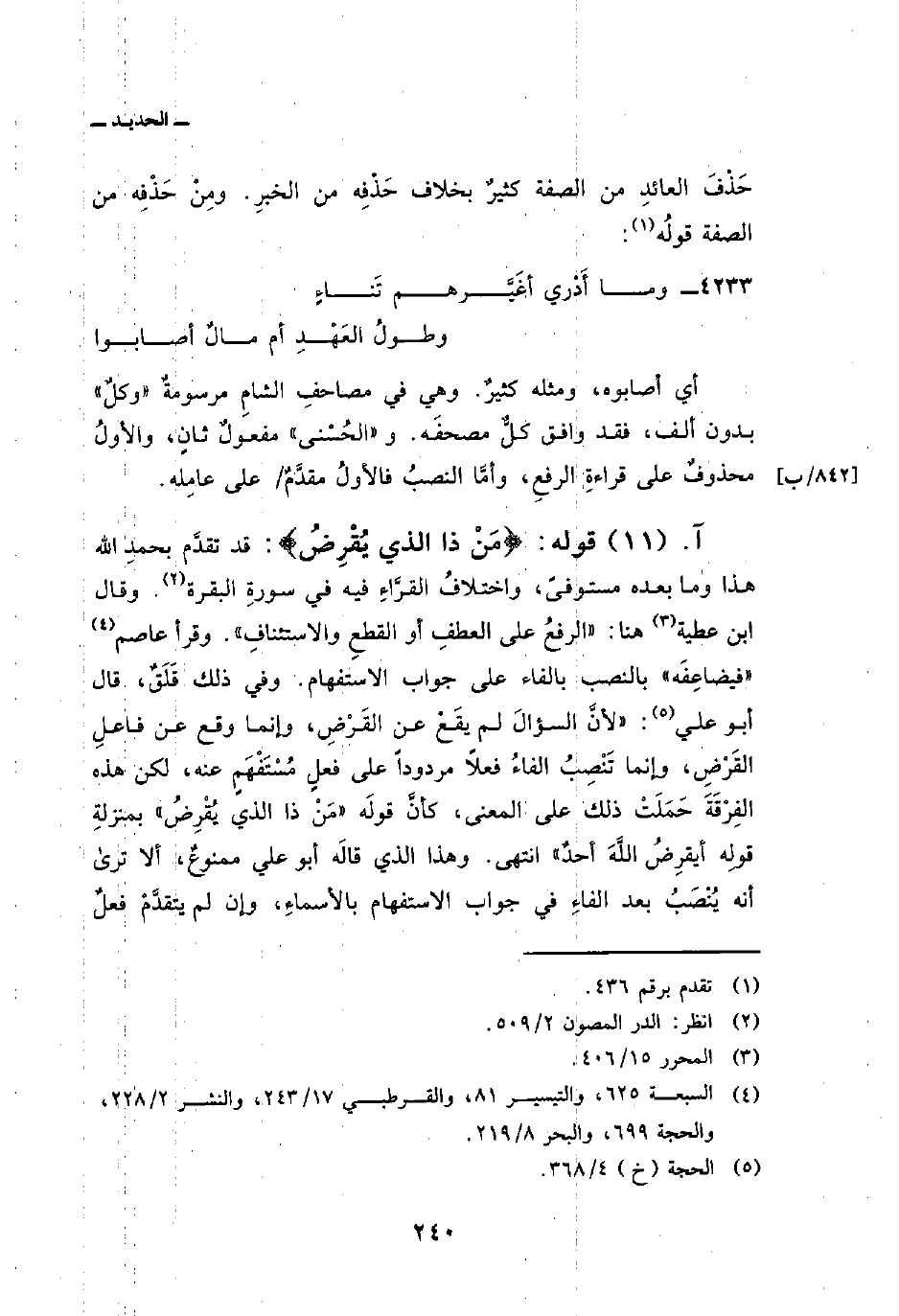 قوله: {مَّن ذَا الذي يُقْرِضُ} : قد تقدَّم بحمدِ الله هذا وما بعده مستوفىً، واختلافُ القرَّاءِ فيه في سورةِ البقرة. وقال ابن عطية هنا: «الرفعُ على العطفِ أو القطعِ والاستئنافِ» . وقرأ عاصم «فيضاعِفَه» بالنصب بالفاء على جواب الاستفهام. وفي ذلك قَلَقٌ، قال أبو علي: «لأنَّ السؤالَ لم يقَعْ عن القَرْضِ، وإنما وقع عن فاعلِ القَرْضِ، وإنما تَنْصِبُ الفاءُ فعلاً مردوداً على فعلِ مُسْتَفْهَمٍ عنه، لكن هذه الفِرْقَةَ حَمَلَتْ ذلك على المعنى، كأنَّ قولَه {مَّن ذَا الذي يُقْرِض} بمنزلةِ قولِه أيقرِضُ اللَّهَ أحدٌ» انتهى. وهذا الذي قالَه أبو علي ممنوعٌ، ألا ترى أنه يُنْصَبُ بعد الفاءِ في جواب الاستفهام بالأسماءِ، وإن لم يتقدَّم فعلٌ