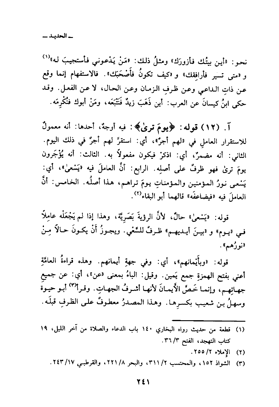 قوله: {يَوْمَ تَرَى} : فيه أوجهٌ، أحدها: أنه معمولٌ للاستقرار العاملِ في «لهم أجرٌ» ، أي: استقرَّ لهم أجرٌ في ذلك اليوم. الثاني: أنه مضمرٌ، أي: اذكرْ فيكون مفعولاً به. الثالث: أنه يُؤْجَرون يومَ ترى فهو ظرفٌ على أصلِه. الرابع: أنَّ العاملَ فيه «يَسْعى» ، أي: يَسْعى نورُ المؤمنين والمؤمناتِ يومَ تراهم، هذا أصلُه. الخامس: أنَّ العاملَ فيه «فيضاعفَه» قالهما أبو البقاء.