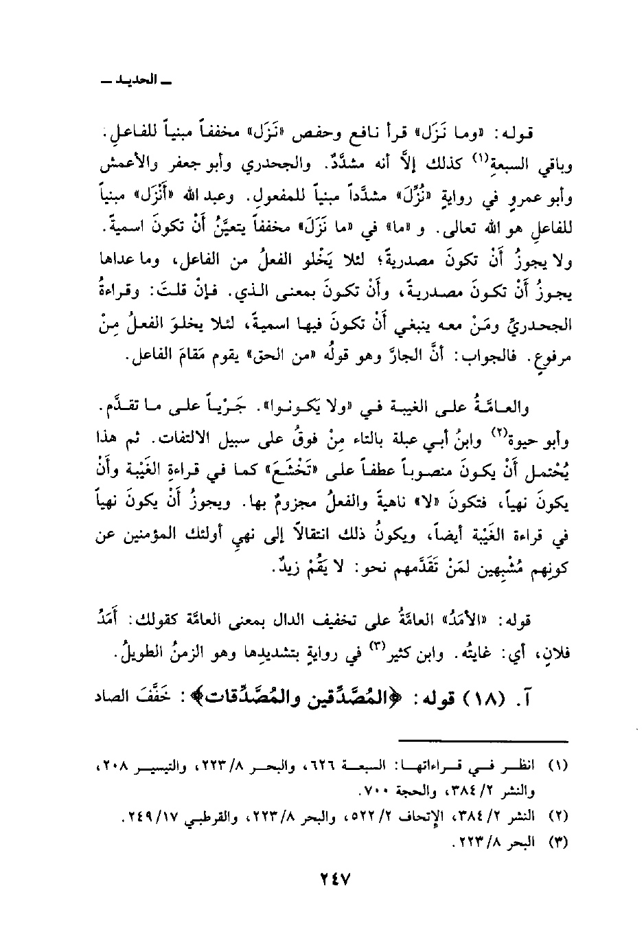 قوله: {وَمَا نَزَلَ} قرأ نافع وحفص «نَزَل» مخففاً مبنياً للفاعلِ. وباقي السبعةِ كذلك إلاَّ أنه مشدَّدٌ. والجحدري وأبو جعفر والأعمش وأبو عمروٍ في روايةٍ «نُزِّلَ» مشدَّداً مبنياً للمفعولِ. وعبد الله «أَنْزَل» مبنياً للفاعلِ هو الله تعالى. و «ما» في «ما نَزَلَ» مخففاً يتعيَّنُ أَنْ تكونَ اسميةً. ولا يجوزُ أَنْ تكونَ مصدريةً؛ لئلا يَخْلو الفعلُ من الفاعل، وما عداها يجوزُ أَنْ تكونَ مصدريةً، وأَنْ تكونَ بمعنى الذي. فإن قلتَ: وقراءةُ الجحدريِّ ومَنْ معه ينبغي أَنْ تكونَ فيها اسميةً، لئلا يخلوَ الفعلُ مِنْ مرفوعٍ. فالجواب: أنَّ الجارَّ وهو قولُه «من الحق» يقوم مَقامَ الفاعل.