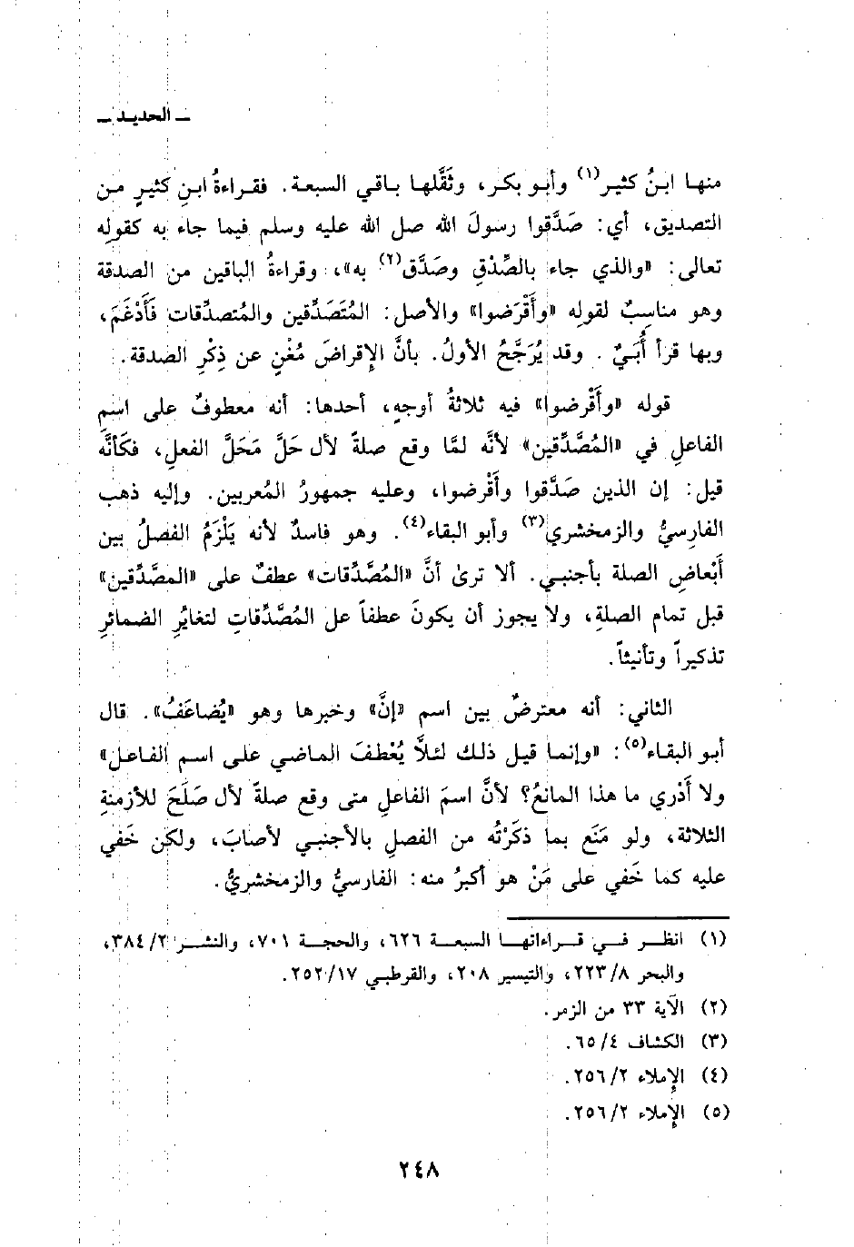منها ابنُ كثير وأبو بكر، وثَقَّلها باقي السبعة. فقراءةُ ابنِ كثيرٍ من التصديق، أي: صَدَّقوا رسولَ الله صَلَّى اللهُ عَلَيْهِ وَسَلَّمَ فيما جاء به كقولِه تعالى: {والذي جَآءَ بالصدق وَصَدَّقَ بِهِ} [الزمر: 33] ، وقراءةُ الباقين من الصدقة وهو مناسِبٌ لقولِه «وأَقْرَضوا» والأصل: المُتَصَدِّقين والمتُصدِّقات فَأَدْغَمَ، وبها قرأ أُبَيٌ. وقد يُرَجَّحُ الأولُ. بأنَّ الإِقراضَ مُغْنٍ عن ذِكْرِ الصدقة.