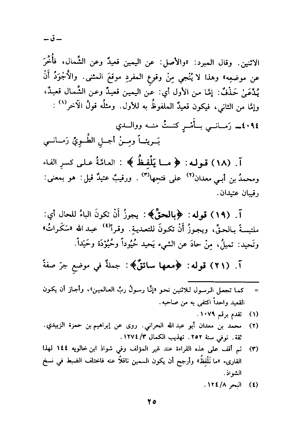 الاثنين. وقال المبرد: «والأصل: عن اليمين قعيدٌ وعن الشِّمال، فأُخِّرَ عن موضعِه» وهذا لا يُنْجي مِنْ وقوعِ المفردِ موقعَ المثنى. والأَجْوَدُ أَنْ يُدَّعَى حَذْفٌ: إمَّا من الأول أي: عن اليمين قعيدٌ وعن الشِّمال قعيدٌ، وإمَّا من الثاني، فيكون قعيدٌ الملفوظُ به للأول، ومثلُه قولُ الآخر: