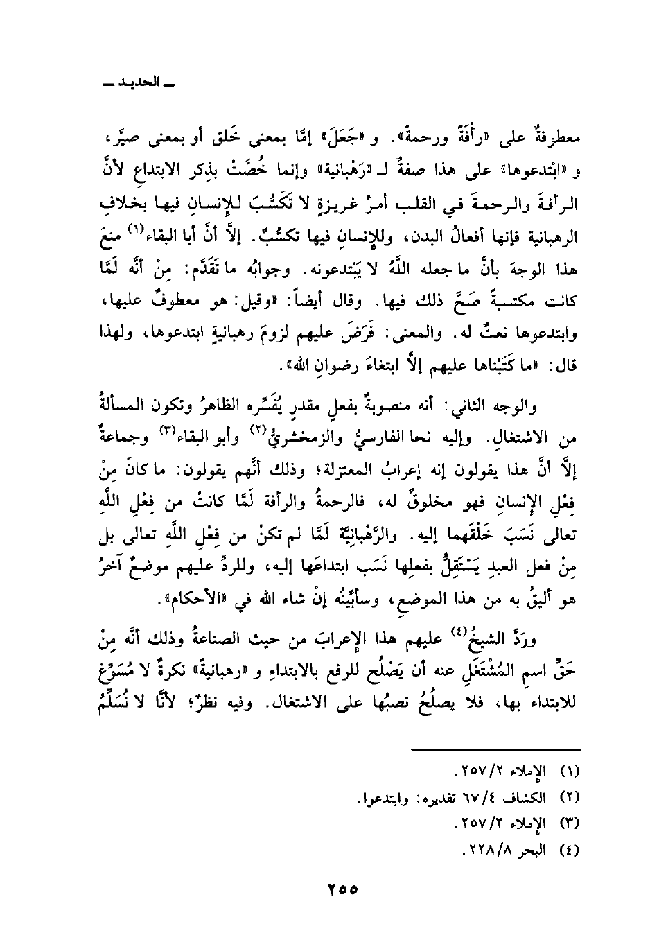 والوجه الثاني: أنه منصوبةٌ بفعلٍ مقدرٍ يُفَسِّره الظاهرُ وتكون المسألةُ من الاشتغالِ. وإليه نحا الفارسيُّ والزمخشريُّ وأبو البقاء وجماعةٌ إلاَّ أنَّ هذا يقولون إنه إعرابُ المعتزلة؛ وذلك أنَّهم يقولون: ما كانَ مِنْ فِعْلِ الإِنسانِ فهو مخلوقٌ له، فالرحمةُ والرأفة لَمَّا كانتْ من فِعْلِ اللَّهِ تعالى نَسَبَ خَلْقَهما إليه. والرَّهْبانِيَّة لَمَّا لم تكنْ من فِعْلِ اللَّهِ تعالى بل مِنْ فعل العبدِ يَسْتَقِلُّ بفعلِها نَسَب ابتداعَها إليه، وللردِّ عليهم موضعٌ آخرُ هو أليقُ به من هذا الموضعِ، وسأبِّينُه إنْ شاء الله في» الأحكام «.