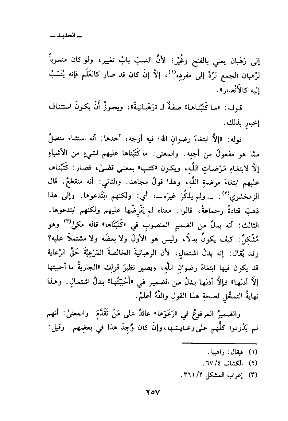 قوله: {إِلاَّ ابتغآء رِضْوَانِ الله} فيه أوجه، أحدها: أنه استثناء متصلٌ ممَّا هو مفعولٌ من أجلِه. والمعنى: ما كَتَبْناها عليهم لشيءٍ من الأشياءِ إلاَّ لابتغاءِ مَرْضاتِ اللَّهِ، ويكون «كتب» بمعنى قضى، فصار: كَتَبْناها عليهم ابتغاءَ مرضاةِ اللَّهِ، وهذا قولُ مجاهد. والثاني: أنه منقطعٌ. قال الزمخشري: ولم يذكُرْ غيرَه، أي: ولكنهم ابْتَدعوها. وإلى هذا ذهبَ قتادةُ وجماعةٌ، قالوا: معناه لم يَفْرِضْها عليهم ولكنهم ابتدعوها. الثالث: أنه بدلٌ من الضميرِ المنصوبِ في «كَتَبْنَاها» قاله مكيُّ وهو مُشْكِلٌ: كيف يكونُ بدلاً، وليس هو الأولَ ولا بعضَه ولا مشتملاً عليه؟ وقد يُقال: إنه بدلُ اشتمالٍ، لأن الرهبانيةَ الخالصةَ المَرْعِيَّةَ حَقَّ الرِّعاية قد يكون فيها ابتغاءَ رضوانِ اللَّهِ، ويصير نظيرَ قولِك «الجاريةُ ما أحببتها إلاَّ أدبَها» فإلاَّ أدبَها بدلٌ من الضمير في «أَحْبَبْتُها» بدلُ اشتمالٍ، وهذا نهايةُ التمحُّلِ لصحةِ هذا القولِ واللَّهُ أعلمُ.