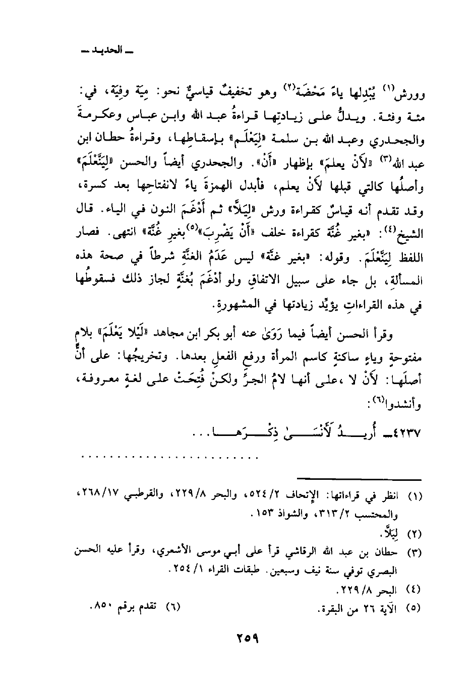 وورش يُبْدِلها ياءً مَحْضَة وهو تخفيفٌ قياسيٌّ نحو: مِيَة وفِيَة، في: مئة وفئة. ويدلُّ على زيادتِها قراءةُ عبد الله وابن عباس وعكرمةَ والجحدري وعبد الله بن سلمة» لِيَعْلَم «بإسقاطِها، وقراءةُ حطان ابن عبد الله» لأَنْ يعلمَ «بإظهار» أَنْ «. والجحدري أيضاً والحسن» لِيَنَّعَلَمَ «وأصلُها كالتي قبلها لأَنْ يعلم، فأبدل الهمزةَ ياءً لانفتاحِها بعد كسرة، وقد تقدم أنه قياسٌ كقراءة ورش» لِيَلاَّ «ثم أَدْغَمَ النون في الياء. قال الشيخ:» بغير غُنَّة كقراءة خلف {أَن يَضْرِبَ} [البقرة: 26] بغيرِ غُنَّة «انتهى. فصار اللفظ لِيَنَّعْلَمَ. وقوله:» بغير غنَّة «ليس عَدَمُ الغنَّةِ شرطاً في صحة هذه المسألةِ، بل جاء على سبيل الاتفاقِ ولو أَدْغَمَ بُغنَّةٍ لجاز ذلك فسقوطُها في هذه القراءاتِ يؤيِّد زيادتها في المشهورةِ.