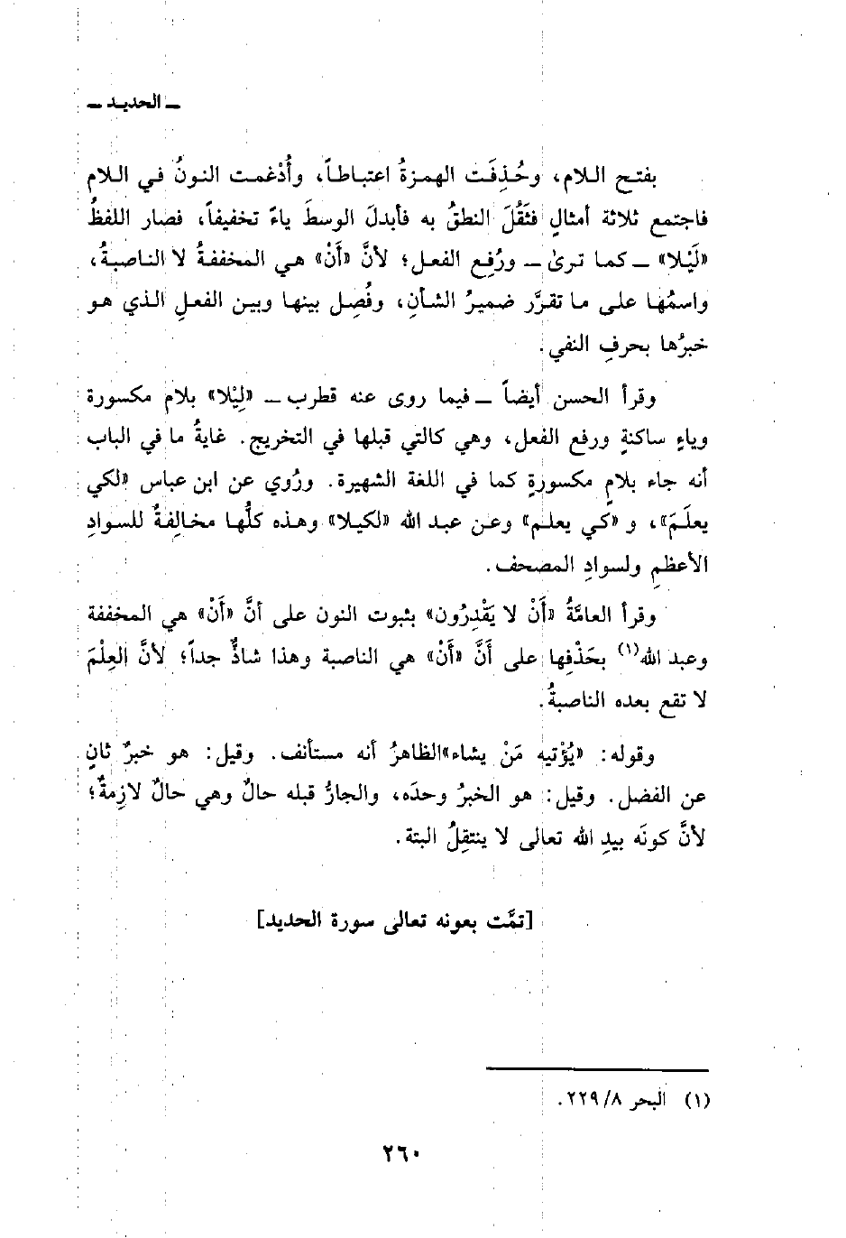 وقرأ الحسن أيضاً فيما روى عنه قطرب «لِيْلا» بلام مكسورة وياءٍ ساكنةٍ ورفع الفعل، وهي كالتي قبلها في التخريج. غايةُ ما في الباب أنه جاء بلامٍ مكسورةٍ كما في اللغة الشهيرة. ورُوي عن ابن عباس «لكي يعلَمَ» ، و «كي يعلم» وعن عبد الله «لكيلا» وهذه كلُّها مخالِفةٌ للسوادِ الأعظمِ ولسوادِ المصحف.