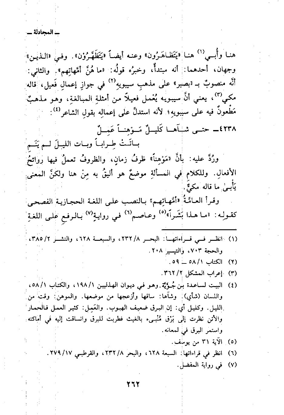هنا وأُبي هنا «يَتَظاهَرُون» وعنه أيضاً «يَتَظَهَّرُوْن» . وفي «الذين» وجهان، أحدهما: أنه مبتدأٌ، وخبرُه قولُه: {مَّا هُنَّ أُمَّهَاتِهِمْ} . والثاني: أنَّه منصوبٌ ب «بصير» على مذهبِ سيبويهِ في جوازِ إعمالِ فَعيل، قاله مكي، يعني أنَّ سيبويه يُعْمل فعيلاً من أمثلةِ المبالغةِ، وهو مذهبٌ مَطْعونٌ فيه على سيبويِهِ؛ لأنه استدلَّ على إعمالِه بقولِ الشاعر: