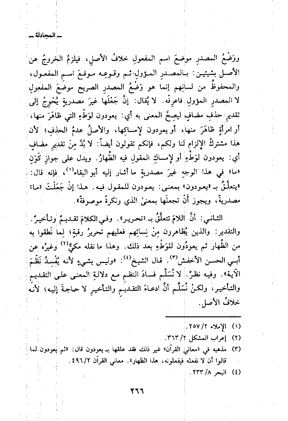ثم وقوعِه موقعَ اسمِ المفعول، والمحفوظُ من لسانِهم إنما هو وَضْعُ المصدرِ الصريح موضعَ المفعولِ لا المصدرِ المؤولِ فاعرِفْه. لا يُقال: إنَّ جَعْلَها غيرَ مصدريةٍ يُحْوِجُ إلى تقديرِ حذفِ مضافٍ ليصِحَّ المعنى به أي: يعودون لوَطْءِ التي ظاهَرَ منها، أو امرأةٍ ظاهَرَ منها، أو يعودون لإِمساكِها، والأصلُ عدمُ الحذفِ؛ لأن هذا مشتركُ الإِلزام لنا ولكم، فإنكم تقولون أيضاً: لا بُدَّ مِنْ تقديرِ مضافٍ أي: يعودون لوَطْءِ أو لإِمساكِ المقولِ فيه الظِّهارُ. ويدل على جوازِ كَوْنِ «ما» في هذا الوجهِ غيرَ مصدريةٍ ما أشار إليه أبو البقاء، فإنه قال: «يتعلَّقُ ب» يعودون «بمعنى: يعودون للمقول فيه. هذا إنْ جَعَلْتَ» ما «مصدريةً، ويجوز أَنْ تجعلَها بمعنى الذي ونكرةً موصوفةً» .