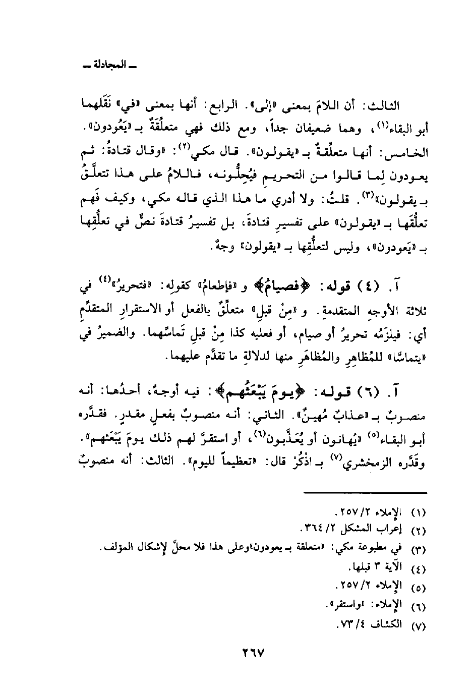 الثالث: أن اللامَ بمعنى «إلى» . الرابع: أنها بمعنى «في» نَقَلهما أبو البقاء، وهما ضعيفان جداً، ومع ذلك فهي متعلِّقَةٌ ب «يَعُودون» . الخامس: أنها متعلِّقةٌ ب «يقولون» . قال مكي: «وقال قتادةُ: ثم يعودون لِما قالوا من التحريمِ فيُحِلُّونه، فاللامُ على هذا تتعلَّقُ ب» يقولون «. قلتُ: ولا أدري ما هذا الذي قاله مكي، وكيف فَهم تعلُّقَها ب» يقولون «على تفسيرِ قتادةَ، بل تفسيرُ قتادةَ نصٌّ في تعلُّقِها ب» يَعودون «، وليس لتعلُّقِها ب» يقولون «وجهٌ.