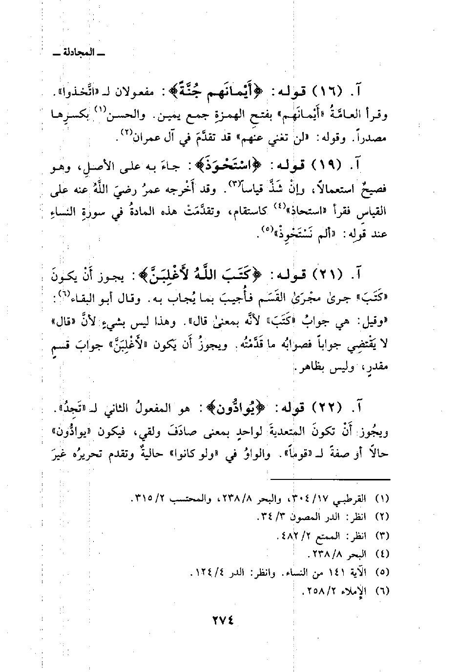 قوله: {أَيْمَانَهُمْ جُنَّةً} : مفعولان ل «اتَّخذوا» . وقرأ العامَّةُ «أَيْمانَهم» بفتحِ الهمزةِ جمع يمين. والحسن بكسرِها مصدراً. وقوله: {لَّن تُغْنِيَ عَنْهُمْ} قد تقدَّمَ في آل عمران.