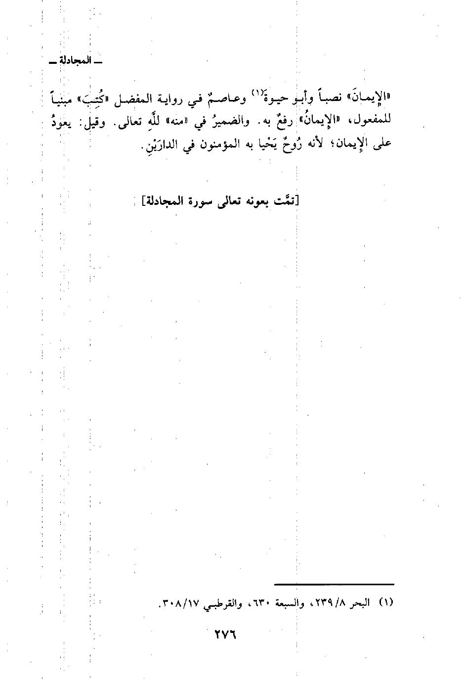 الإِيمانَ» نصباً وأبو حيوةَ وعاصمٌ في رواية المفضل «كُتِبَ» مبنياً للمفعول، «الإِيمانُ» رفعٌ به. والضميرُ في «منه» للَّهِ تعالى. وقيل: يعودُ على الإِيمان؛ لأنه رُوحٌ يَحْيا به المؤمنون في الدارَيْنِ.