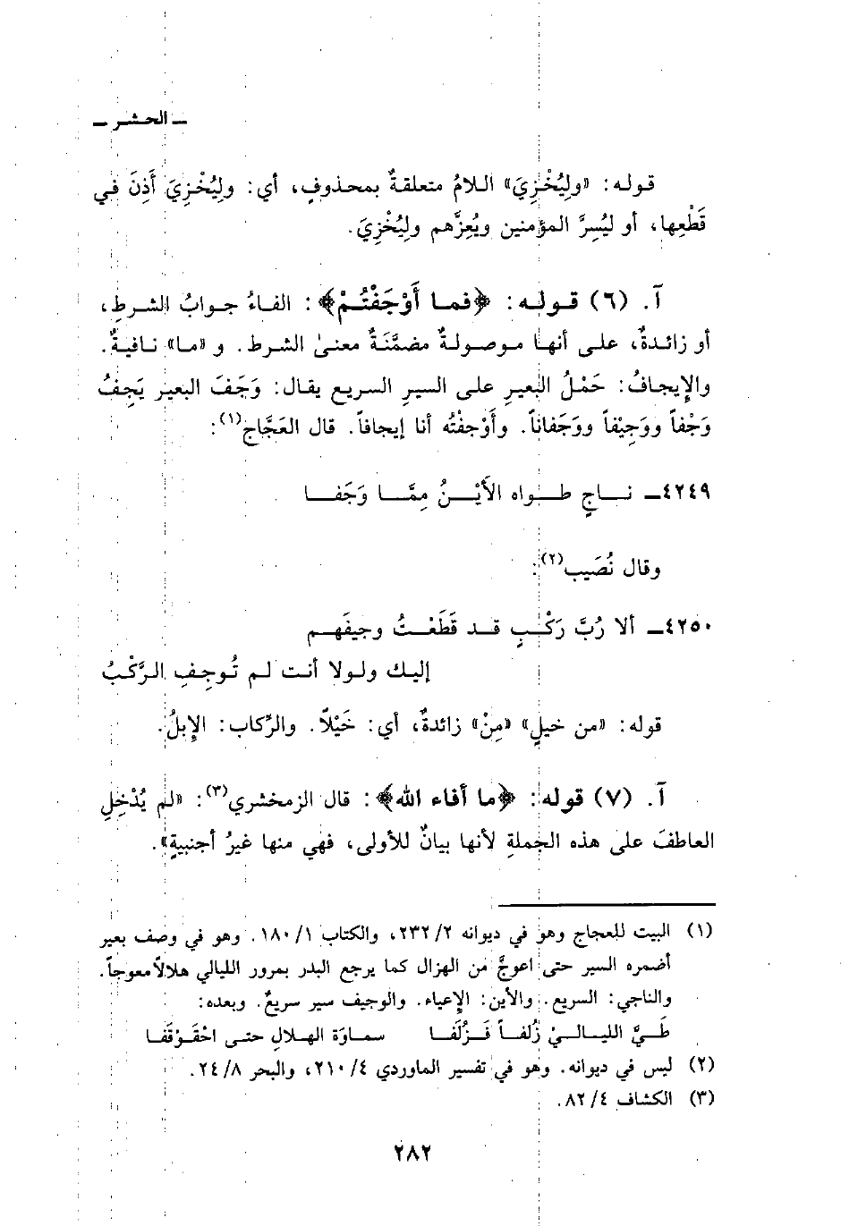 قوله: {فَمَآ أَوْجَفْتُمْ} : الفاءُ جوابُ الشرطِ، أو زائدةٌ، على أنها موصولةٌ مضمَّنَةٌ معنى الشرط. و «ما» نافيةٌ. والإِيجافُ: حَمْلُ البعيرِ على السيرِ السريع يقال: وَجَفَ البعير يَجِفُ وَجْفاً ووَجِيْفاً ووَجَفاناً. وأَوْجفْتُه أنا إيجافاً. قال العَجَّاج:
