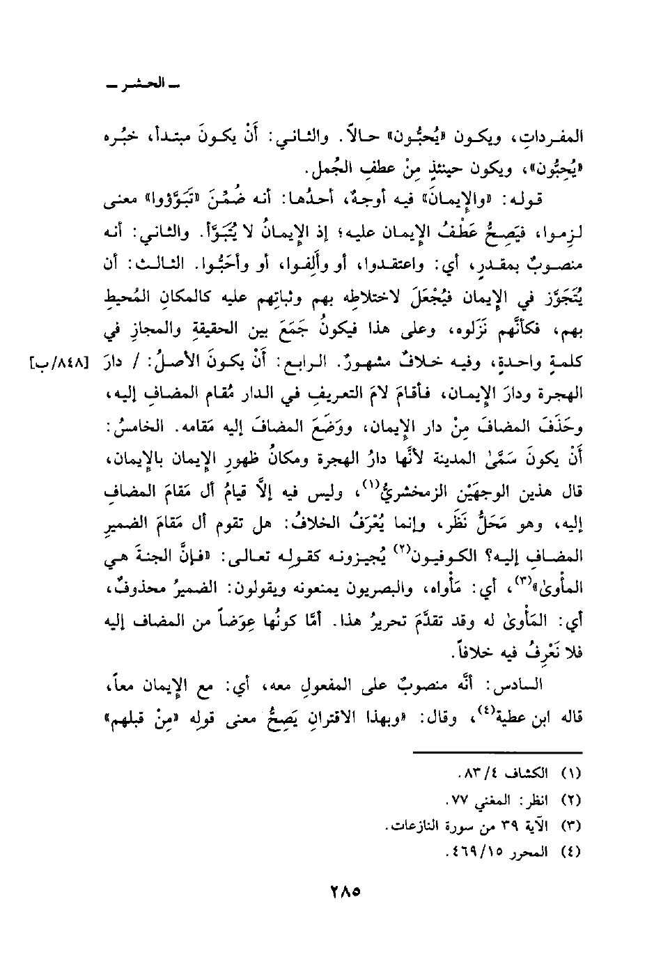 قوله: {والإيمان} فيه أوجهٌ، أحدُها: أنه ضُمِّنَ «تَبَوَّؤوا» معنى لزِموا، فيَصِحُّ عَطْفُ الإِيمان عليه؛ إذ الإيمانُ لا يُتَبَوَّأ. والثاني: أنه منصوبٌ بمقدرٍ، أي: واعتقدوا، أو وأَلِفوا، أو وأحَبُّوا. الثالث: أن يُتَجَوَّز في الإِيمان فيُجْعَلَ لاختلاطِه بهم وثباتِهم عليه كالمكانِ المُحيطِ بهم، فكأنَّهم نَزَلوه، وعلى هذا فيكونُ جَمَعَ بين الحقيقةِ والمجازِ في كلمةٍ واحدةٍ، وفيه خلافٌ مشهورٌ. الرابع: أَنْ يكونَ الأصلُ: / دارَ الهجرة ودارَ الإِيمان، فأقامَ لامَ التعريفِ في الدار مُقام المضافِ إليه، وحَذَفَ المضافَ مِنْ دار الإِيمان، ووَضَعَ المضافَ إليه مَقامه. الخامسُ. أَنْ يكونَ سَمَّى المدينة لأنَّها دارُ الهجرة ومكانُ ظهورِ الإِيمان بالإِيمان، قال هذين الوجهَيْنِ الزمخشريُّ، وليس فيه إلاَّ قيامُ أل مَقامَ المضافِ إليه، وهو مَحَلُّ نَظَر، وإنما يُعْرَفُ الخلافُ: هل تقوم أل مَقامَ الضميرِ المضاف إليه؟ الكوفيون يُجيزونه كقولِه تعالى: {فَإِنَّ الجنة هِيَ المأوى} [النازعات: 39] ، أي: مَأْواه، والبصريون يمنعونه ويقولون: الضميرُ محذوفٌ، أي: المَأْوى له وقد تقدَّمَ تحريرُ هذا. أمَّا كونُها عِوَضاً من المضاف إليه فلا نَعْرِفُ فيه خلافاً.