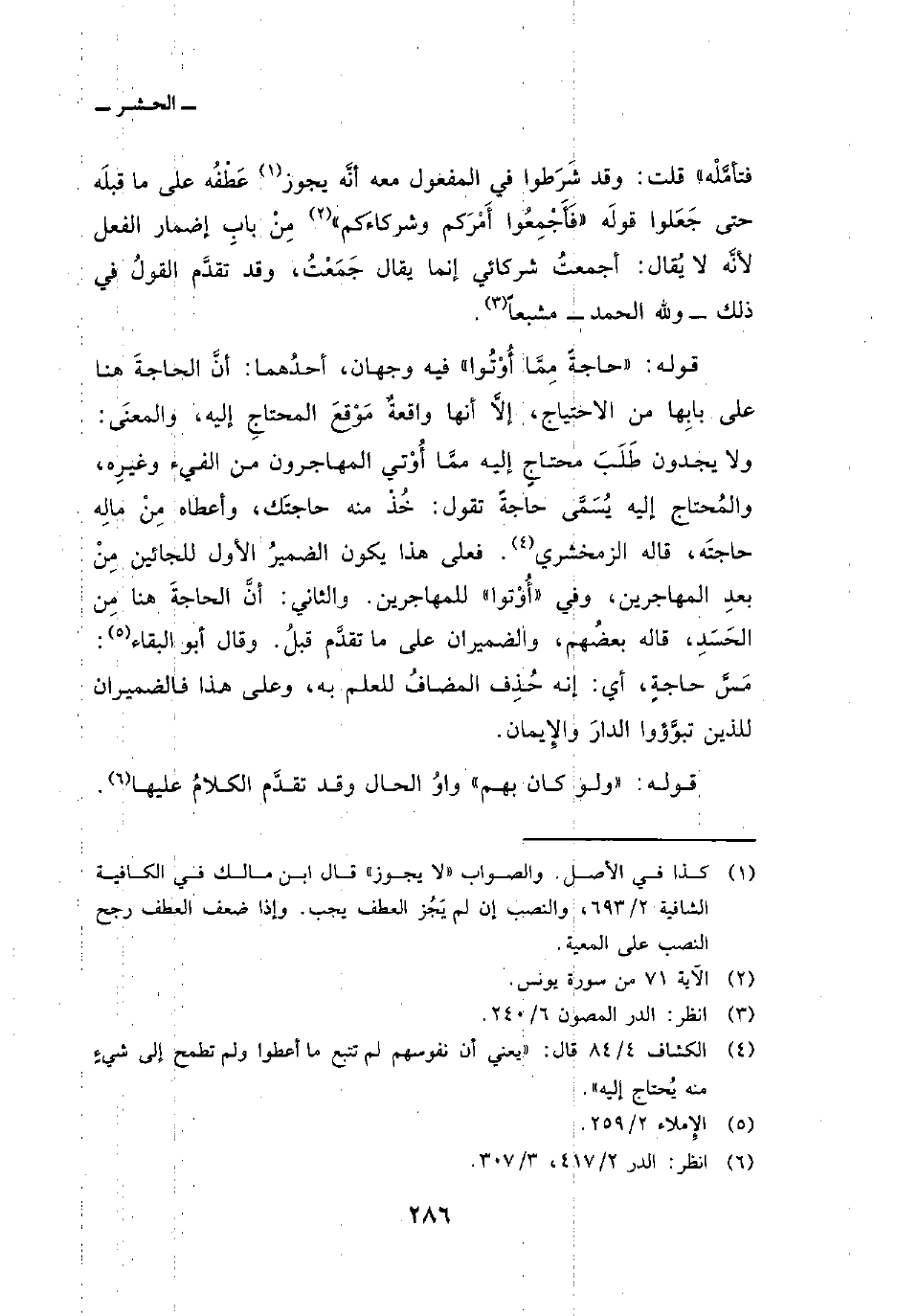 قوله: {حَاجَةً مِّمَّآ أُوتُواْ} فيه وجهان، أحدُهما: أنَّ الحاجةَ هنا على بابِها من الاحتياج، إلاَّ أنها واقعةٌ مَوْقعَ المحتاجِ إليه، والمعنَى: ولا يجدون طَلَبَ محتاجٍ إليه ممَّا أُوْتي المهاجرون من الفيء وغيِره، والمُحتاج إليه يُسَمَّى حاجةً تقول: خُذْ منه حاجتَك، وأعطاه مِنْ مالِه حاجتَه، قاله الزمشخري. فعلى هذا يكون الضميرُ الأول للجائين مِنْ بعدِ المهاجرين، وفي «أُوْتوا» للمهاجرين. والثاني: أنَّ الحاجةَ هنا مِنْ الحَسَدِ، قاله بعضُهم، والضميران على ما تقدَّم قبل. وقال أبو البقاء: مَسَّ حاجةٍ، أي: إنه حُذِف المضافُ للعلم به، وعلى هذا فالضميران للذين تبوَّؤوا الدارَ والإِيمان.