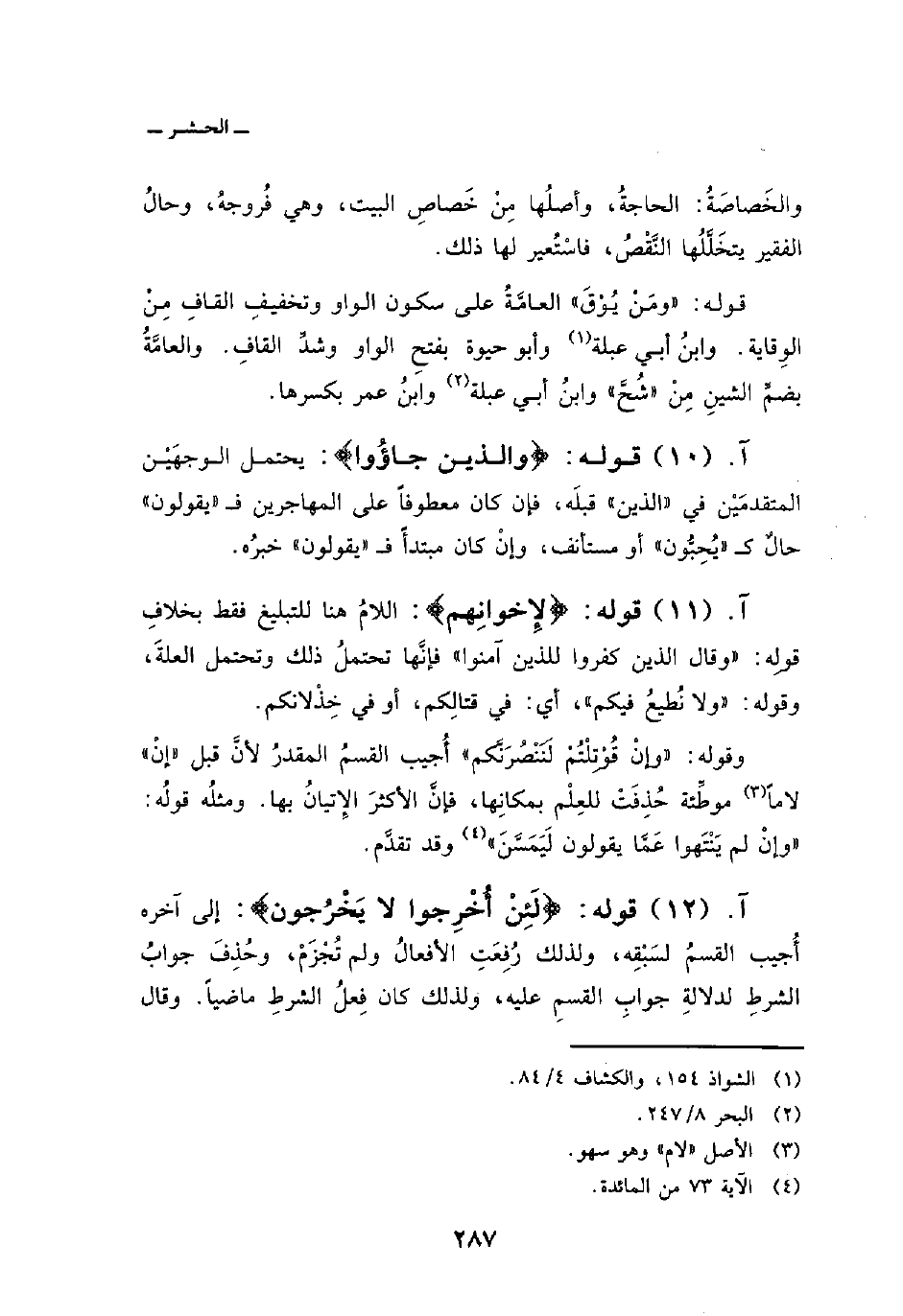 وقوله: {وَإِن قُوتِلْتُمْ لَنَنصُرَنَّكُمْ} أُجيب القسمُ المقدرُ لأنَّ قبل «إنْ» لاماً موطِّئة حُذِفَتْ للعِلْم بمكانِها، فإنَّ الأكثرَ الإِتيانُ بها. ومثلُه قولُه: {وَإِن لَّمْ يَنتَهُواْ عَمَّا يَقُولُونَ لَيَمَسَّنَّ} [المائدة: 73] وقد تقدَّم.