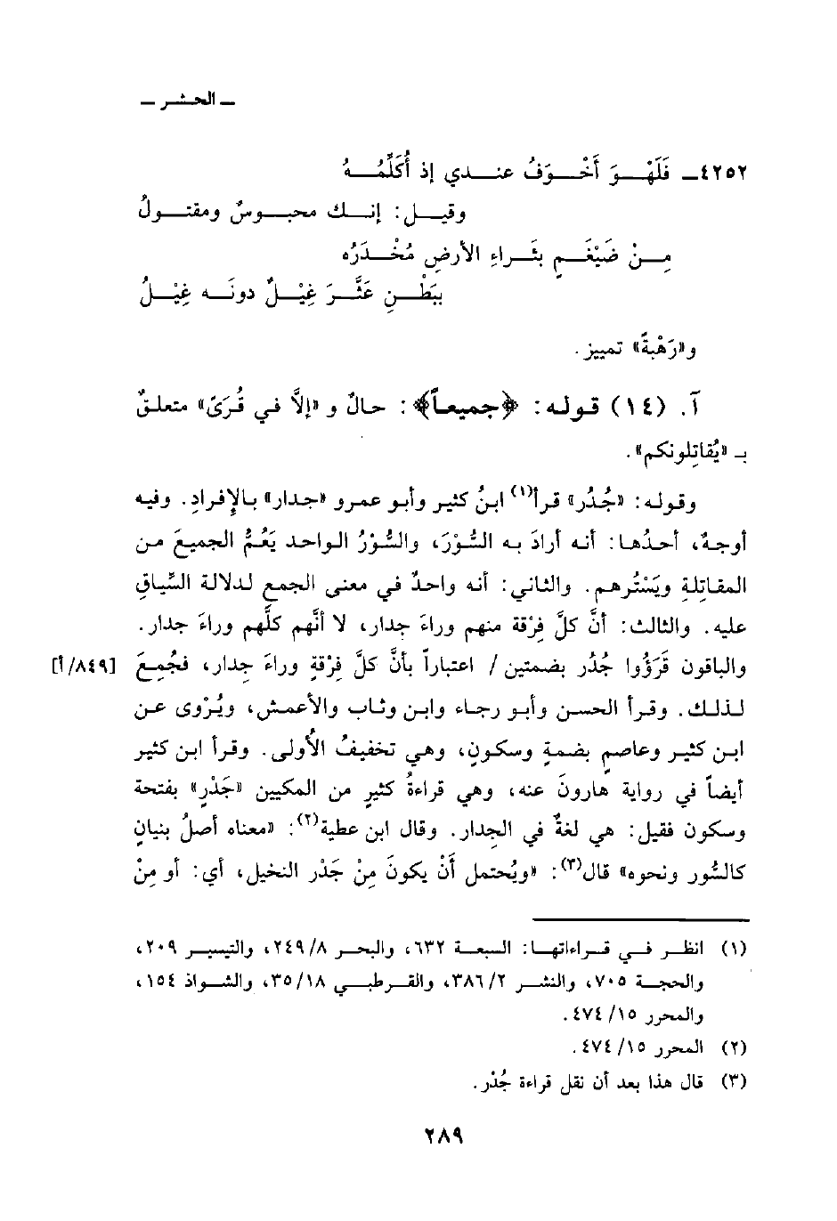 وقوله: {جُدُرٍ} قرأ ابنُ كثير وأبو عمرو «جدار» بالإِفرادِ. وفيه أوجهٌ، أحدُها: أنه أرادَ به السُّوْرَ، والسُّوْرُ الواحد يَعُمُّ الجميعَ من المقاتِلةِ ويَسْتُرهم. والثاني: أنه واحدٌ في معنى الجمع لدلالة السِّياقِ عليه. والثالث: أنَّ كلَّ فِرْقة منهم وراءَ جدار، لا أنَّهم كلَّهم وراءَ جدار. والباقون قَرَؤُوا جُدُر بضمتين/ اعتباراً بأنَّ كلَّ فِرْقةٍ وراءَ جدار، فجُمِعَ لذلك. وقرأ الحسن وأبو رجاء وابن وثاب والأعمش، ويُرْوى عن ابن كثير وعاصمٍ بضمةٍ وسكونٍ، وهي تخفيفُ الأُولى. وقرأ ابن كثير أيضاً في وراية هارونَ عنه، وهي قراءةُ كثيرٍ من المكيين «جَدْرٍ» بفتحة وسكون فقيل: هي لغةٌ في الجِدار. وقال ابن عطية: «معناه أصلُ بنيانٍ كالسُّور ونحوه» قال: «ويُحتمل أَنْ يكونَ مِنْ جَدْر النخيل، أي: أو مِنْ