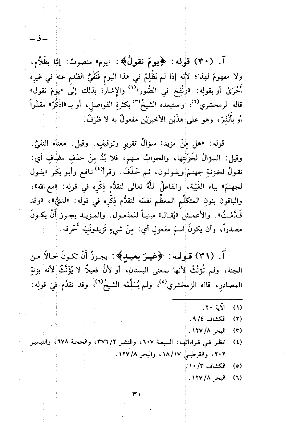 قوله: {يَوْمَ نَقُولُ} : «يوم» منصوبٌ: إمَّا بظَلاَّم، ولا مفهومَ لهذا؛ لأنه إذا لم يَظْلِمْ في هذا اليومِ فَنَفْيُ الظلمِ عنه في غيرِه أَحْرَى أو بقولِه: {وَنُفِخَ فِي الصور} [ق: 20] والإِشارة بذلك إلى «يومَ نقول» قاله الزمخشري، واستبعده الشيخُ بكثرةِ الفواصلِ، أو ب «اذْكُرْ» مقدَّراً أو بأَنْذِرْ، وهو على هذَيْن الأخيرَيْن مفعولٌ به لا ظرفٌ.