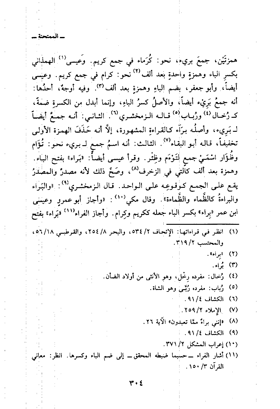 همزتَيْن، جمعَ بريء، نحو: كُرَماء في جمع كريم. وَعيسى الهمذاني بكسرِ الباء وهمزةٍ واحدةٍ بعد ألف نحو: كرام في جمع كريم. وعيسى أيضاً، وأبو جعفر، بضم الباءِ وهمزةٍ بعد ألف. وفيه أوجهٌ، أحدُها: أنه جمعُ بَرِيْء أيضاً، والأصلُ كسرُ الباءِ، وإنما أبدل من الكسرةِ ضمةً، ك رُخال ورُباب قاله الزمخشري. الثاني: أنه جمعٌ أيضاً ل بَرِيء، وأصلُه برَآء كالقراءةِ المشهورة، إلاَّ أنه حَذَفَ الهمزة الأولى تخفيفاً، قاله أبو البقاء. الثالث: أنه اسمُ جمعٍ ل بريء نحو: تُؤَام وظُؤَار اسْمَيْ جمعٍ لتَوْءَم وظِئْر. وقرأ عيسى أيضاً: «بَراء» بفتح الباء. وهمزة بعد ألف كالتي في الزخرف، وصَحَّ ذلك لأنه مصدرٌ والمصدرُ يقع على الجمع كوقوعِه على الواحد. قال الزمخشري: «والبَراء والبراءةُ كالظَّماء والظَّماءة» . وقال مكي: «وأجاز أبو عمروٍ وعيسى ابن عمر» بِراء «بكسر الباء جعله ككريم وكِرام. وأجاز الفراء» بَراء «بفتح