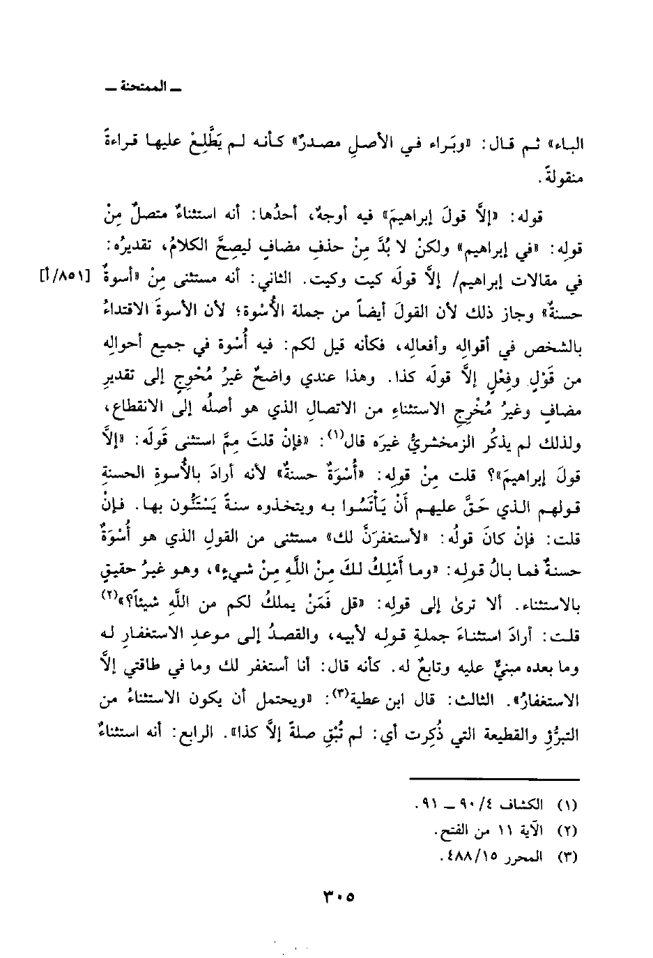 قوله: {إِلاَّ قَوْلَ إِبْرَاهِيمَ} فيه أوجهٌ، أحدُها: أنه استثناءٌ متصلٌ مِنْ قولِه: «في إبراهيم» ولكنْ لا بُدَّ مِنْ حذفِ مضافٍ ليصِحَّ الكلامُ، تقديرُه: في مقالات إبراهيم/ إلاَّ قولَه كيت وكيت. الثاني: أنه مستثنى مِنْ «أسوةٌ حسنةٌ» وجاز ذلك لأن القولَ أيضاً من جملة الأُسْوة؛ لأن الأسوةَ الاقتداءُ بالشخص في أقوالِه وأفعالِه، فكأنه قيل لكم: فيه أُسْوة في جميع أحوالِه من قَوْلٍ وفِعْلٍ إلاَّ قولَه كذا. وهذا عندي واضحٌ غيرُ مُحْوِجٍ إلى تقديرِ مضافٍ وغيرُ مُخْرِجِ الاستثناءِ من الاتصالِ الذي هو أصلُه إلى الانقطاع، ولذلك لم يذكُر الزمخشريُّ غيرَه قال: «فإنْ قلتَ مِمَّ استثنى قَولَه: {إِلاَّ قَوْلَ إِبْرَاهِيمَ} ؟ قلت مِنْ قولِه:» أُسْوَةٌ حسنةٌ «لأنه أرادَ بالأُسوةِ الحسنةِ قولهم الذي حَقَّ عليهم أَنْ يَأْتَسُوا به ويتخذوه سنةً يَسْتَنُّون بها.