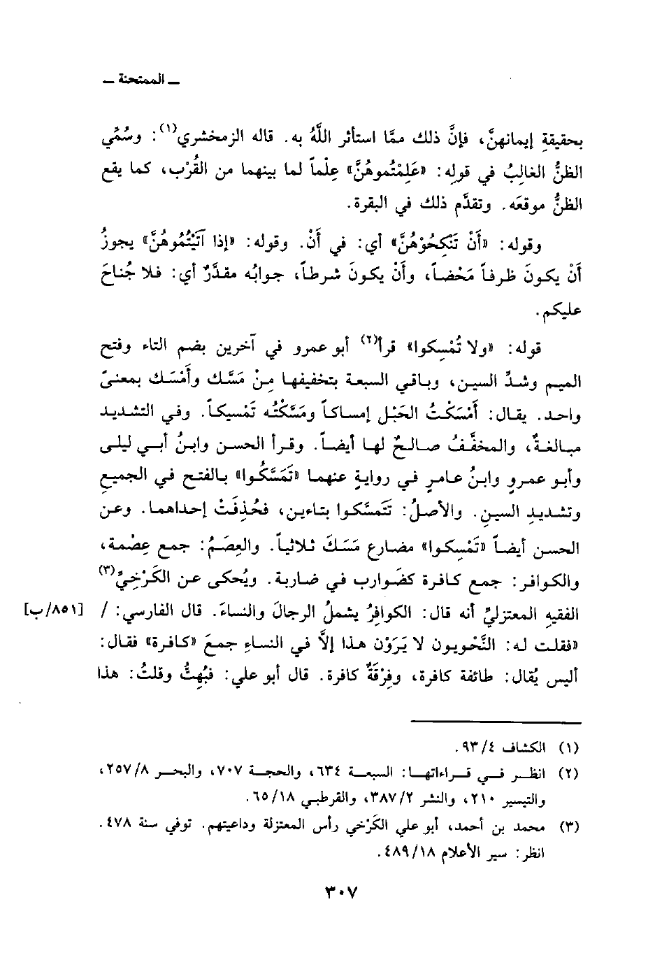 قوله: {وَلاَ تُمْسِكُواْ} قرأ أبو عمرو في آخرين بضم التاء وفتح الميم وشدِّ السين، وباقي السبعة بتخفيفها مِنْ مَسَّك وأَمْسَك بمعنىً واحد. ويقال: أَمْسَكْتُ الحَبْل إمساكاً ومَسَّكْتُه تَمْسكياً. وفي التشديد مبالغةٌ، والمخفَّفُ صالحٌ لها أيضاً. وقرأ الحسن وابنُ أبي ليلى وأبو عمروٍ وابنُ عامرٍ في روايةٍ عنهما «تَمَسَّكُوا» بالفتح في الجميعِ وتشديدِ السينِ. والأصلُ: تَتَمسَّكوا بتاءين، فحُذِفَتْ إحداهما. وعن الحسن أيضاً «تَمْسِكوا» مضارع مَسَكَ ثلاثياً. والعِصَمُ: جمع عِصْمة، والكوافر: جمع كافرة كضَوارب في ضاربة. ويُحكى عن الكَرْخِيِّ الفقيهِ المعتزليِّ أنه قال: الكوافِرُ يشملُ الرجالَ والنساءَ. قال الفارسي: / «فقلت له: النَّحْويون لا يَرَوْن هذا إلاَّ في النساءِ جمعَ» كافرة «فقال: أليس يُقال: طائفة كافرة، وفِرْقَةٌ كافرة. قال أبو علي: فبُهِتُّ وقلتُ: هذا