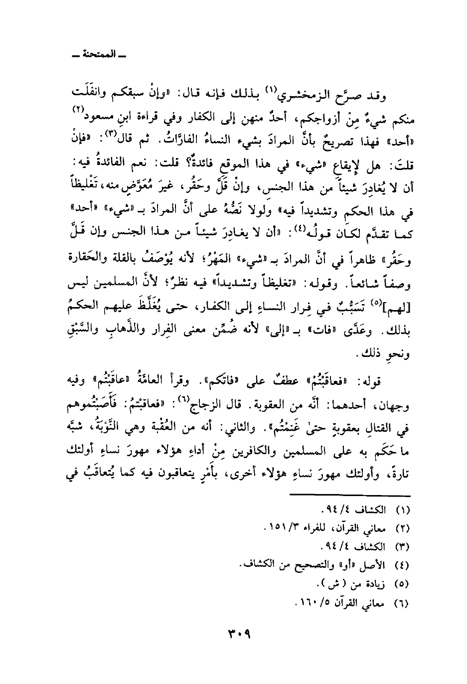 وقد صرَّح الزمخشري بذلك فإنه قال: «وإنْ سبقكم وانفَلَت منكم شيءٌ مِنْ أزواجكم، أحدٌ منهن إلى الكفار وفي قراءة ابنِ مسعود» أحد «فهذا تصريحٌ بأنَّ المرادَ بشيء النساءُ الفارَّاتُ. ثم قال:» فإنْ قلتَ: هل لإِيقاع «شيء» في هذا الموقعِ فائدةٌ؟ قلت: نعم الفائدةُ فيه: أن لا يُغادِرَ شيئاً من هذا الجنسِ، وإنْ قَلَّ وحَقُر، غيرَ مُعَوَّضٍ منه، تَغْليظاً في هذا الحكم وتشديداً فيه «ولولا نَصُّهُ على أنَّ المرادَ ب» شيء «» أحد «كما تقدَّم لكَان قولُه:» أن لا يغادِرَ شيئاً من هذا الجنس وإن قَلَّ وحَقُر «ظاهراً في أنَّ المرادَ ب» شيء «المَهْرُ؛ لأنه يُوْصَفُ بالقلة والحَقارة وصفاً شائعاً. وقوله:» تغليظاً وتشديداً «فيه نظرٌ؛ لأنَّ المسلمين ليس [لهم] تَسَبُّبٌ في فِرار النساءِ إلى الكفار، حتى يُغَلَّظَ عليهم الحكمُ بذلك. وعَدَّى» فات «ب» إلى «لأنه ضُمِّن معنى الفِرار والذَّهابِ والسَّبْقِ ونحوِ ذلك.