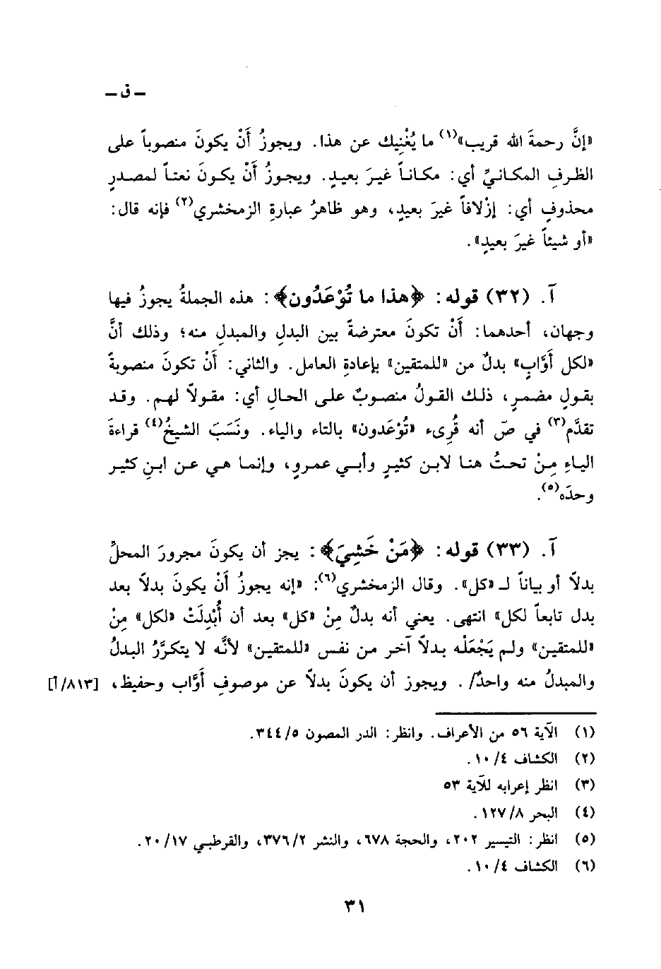 قوله: {هذا مَا تُوعَدُونَ} : هذه الجملةُ يجوزُ فيها وجهان، أحدهما: أَنْ تكونَ معترضةً بين البدلِ والمبدلِ منه؛ ولذلك أنَّ «لكل أَوَّابٍ» بدلٌ من «للمتقين» بإعادةِ العامل. والثاني: أَنْ تكونَ مصنوبةً بقولٍ مضمرٍ، ذلك القولُ منصوبٌ على الحالِ أي: مقولاً لهم. وقد تقدَّم في ص أنه قُرِىء «تُوْعَدون» بالتاء والياء. ونَسَبَ الشيخُ قراءةَ الياءِ مِنْ تحتُ هنا لابن كثيرٍ وأبي عمروٍ، وإنما هي عن ابن كثير وحدَه.