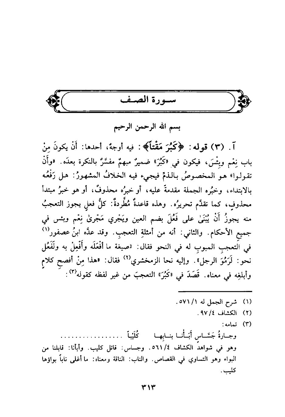 قوله: {كَبُرَ مَقْتاً} : فيه أوجهٌ، أحدها: أَنْ يكونَ مِنْ باب نِعْم وبِئْسَ، فيكون في «كَبُرَ» ضميرٌ مبهمٌ مفسَّرٌ بالنكرة بعدَه. «وأَنْ تقولوا» هو المخصوصُ بالذمِّ فيجيء فيه الخلافُ المشهورُ: هل رَفْعُه بالابتداء، وخبرُه الجملة مقدمةً عليه، أو خبرُه محذوفٌ، أو هو خبرُ مبتدأ محذوفٍ، كما تقدَّم تحريرُه. هذه قاعدةٌ مُطَّردةٌ: كلُّ فعلٍ يجوز التعجبُ منه يجوزُ أَنْ يُبْنَى على فَعُلَ بضم العين ويَجْري مَجْرى نِعْم وبئس في جميعِ الأحكام. والثاني: أنه من أمثلةِ التعجبِ. وقد عدَّه ابنُ عصفور في التعجبِ المبوبِ له في النحو فقال: «صيغة ما أفْعَلَه وأَفْعِلْ به ولَفَعُل نحو: لَرَمُوَ الرجل» . وإليه نحا الزمخشري فقال: «هذا مِنْ أفصحِ كلامٍ وأبلغِه في معناه. قَصَدَ في» كَبُرَ «التعجَب من غير لفظه كقوله: