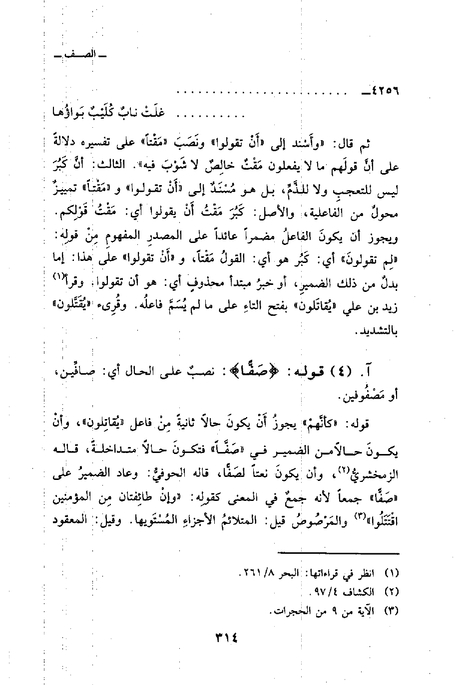 ثم قال:» وأَسْند إلى «أَنْ تقولوا» ونَصَبَ «مَقْتاً» على تفسيره دلالةً على أنَّ قولَهم ما لا يفعلون مَقْتٌ خالِصٌ لا شَوْبَ فيه «. الثالث: أنَّ كَبُرَ ليس للتعجبِ ولا للذَّمِّ، بل هو مُسْنَدٌ إلى» أَنْ تقولوا «و» مَقْتاً «تمييزٌ محولٌ من الفاعلية، والأصل: كَبُرَ مَقْتُ أَنْ يقولوا أي: مَقْتُ قَوْلِكم. ويجوز أن يكونَ الفاعلُ مضمراً عائداً على المصدرِ المفهومِ مِنْ قولِه:» لِم تقولونَ «أي: كَبُر هو أي: القولُ مَقْتاً، و» أَنْ تقولوا «على هذا: إما بدلٌ من ذلك الضميرِ، أو خبرُ مبتدأ محذوفٍ أي: هو أن تقولوا. وقرأ زيد بن علي» يُقاتَلون «بفتح التاءِ على ما لم يُسَمَّ فاعلُه. وقُرِىء» يُقَتَّلون «بالتشديد.