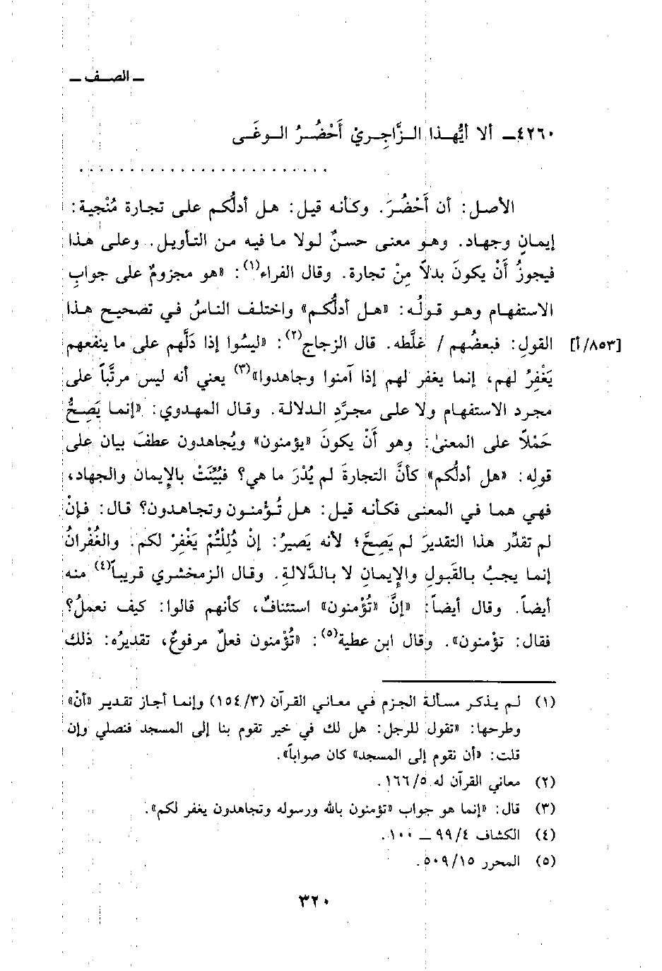 الأصل: أن أَحْضُرَ. وكأنه قيل: هل أدلُّكم على تجارة مُنْجية: إيمانٍ وجهاد. وهو معنى حسنٌ لولا ما فيه من التأويل. وعلى هذا فيجوزُ أَنْ يكونَ بدلاً مِنْ تجارة. وقال الفراء: هو مجزومٌ على جوابِ الاستفهام وهو قولُه: «هل أدلُّكم» واختلف الناسُ في تصحيح هذا القولِ: فبعضُهم/ غلَّطه. قال الزجاج: ليسُوا إذا دَلَّهم على ما ينفعهم يَغْفِرُ لهم، إنما يغفر لهم إذا آمنوا وجاهدوا «يعني أنه ليس مرتَّباً على مجرد الاستفهام ولا على مجرَّدِ الدلالة. وقال المهدوي:» إنما يَصِحُّ حَمْلاً على المعنى: وهو أَنْ يكونَ «يؤمنون» ويُجاهدون عطفَ بيان على قولِه: «هل أدلُّكم» كأنَّ التجارةَ لم يُدْرَ ما هي؟ فبُيِّنَتْ بالإِيمان والجهاد، فهي هما في المعنى فكأنه قيل: هل تُؤْمنون وتجاهدون؟ قال: فإنْ لم تقدِّر هذا التقديرَ لم يَصِحَّ؛ لأنه يَصيرُ: إنْ دُلِلْتُمْ يَغْفِرْ لكم. والغُفْرانُ إنما يجبُ بالقَبولِ والإِيمانِ لا بالدَّلالةِ. وقال الزمخشري قريباً منه أيضاً. وقال أيضاً: «إنَّ» تُؤْمنون «استئنافٌ، كأنهم قالوا: كيف نعملُ؟ فقال: تؤْمنون» . وقال ابن عطية: «تُؤْمنون فعلٌ مرفوعٌ، تقديرُه: ذلك