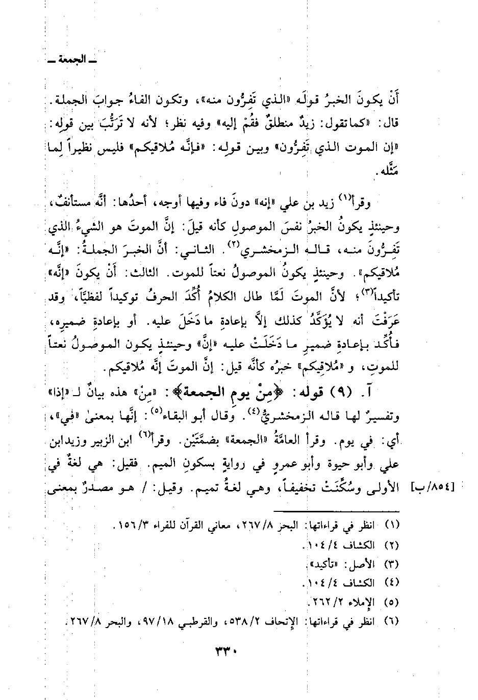 وقرأ زيد بن علي «إنه» دونَ فاء وفيها أوجه، أحدُها: أنَّه مستأنفٌ، وحينئذٍ يكونُ الخبرُ نفسَ الموصولِ كأنه قيلَ: إنَّ الموتَ هو الشيءُ الذي تَفِرُّونَ منه، قاله الزمخشري. الثاني: أنَّ الخبرَ الجملةُ: «إنَّه مُلاقيكم» . وحينئذٍ يكونُ الموصولُ نعتاً للموت. الثالث: أَنْ يكونَ «إنَّه» تأكيداً؛ لأنَّ الموتَ لَمَّا طال الكلامُ أُكِّدَ الحرفُ توكيداً لفظيَّاً، وقد عَرَفْتَ أنه لا يُؤَكَّدُ كذلك إلاَّ بإعادةِ ما دَخَلَ عليه. أو بإعادةِ ضميرِه، فأُكِّد بإعادةِ ضمير ما دَخَلَتْ عليه «إنَّ» وحينئذٍ يكون الموصولُ نعتاً للموتِ، و «مُلاقِيكم» خبرُه كأنه قيل: إنَّ الموتَ إنَّه مُلاقيكم.