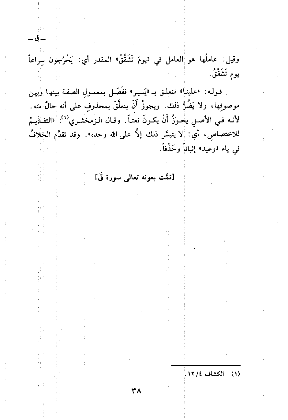 قوله: {عَلَيْنَا} متعلق ب «يَسير» ففَصَل بمعمولِ الصفة بينها وبين موصوفِها، ولا يَضُرُّ ذلك. ويجوزُ أَنْ يتعلَّقَ بمحذوفٍ على أنه حالٌ منه. لأنه في الأصلِ يجوزُ أَنْ يكونَ نعتاً. وقال الزمخشري: «التقديمُ للاختصاصِ، أي: لا يتيسَّر ذلك إلاَّ على الله وحده» . وقد تقدَّم الخلافُ في ياء «وعيد» إثباتاً وحَذْفاً.