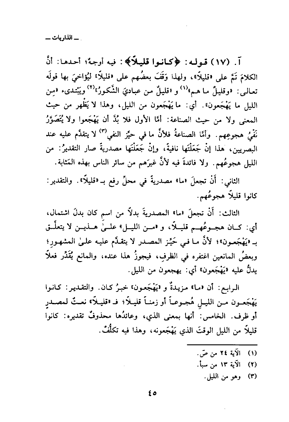الرابع: أن «ما» مزيدةٌ و «يَهْجَعون» خبرُ كان. والتقدير: كانوا يَهْجَعون من الليلِ هُجوعاً أو زمناً قليلاً؛ ف «قليلاً» نعتٌ لمصدرٍ أو ظرف. الخامس: أنها بمعنى الذي، وعائدُها محذوفٌ تقديره: كانوا قليلاً من الليل الوقتَ الذي يَهْجَعونه، وهذا فيه تكلُّفٌ.