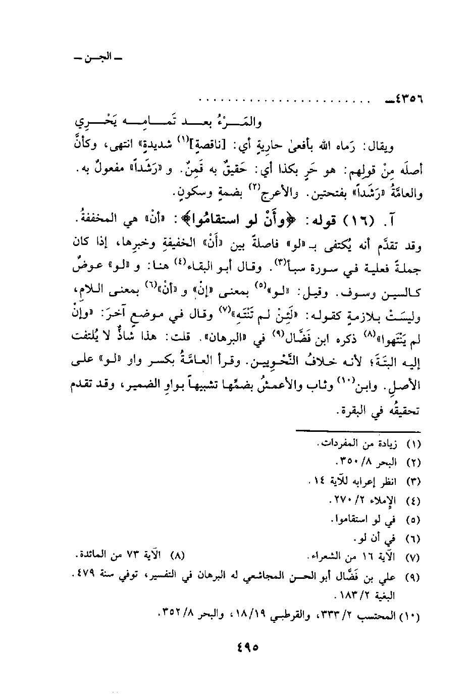 قوله: {وَأَلَّوِ استقاموا} : «أنْ» هي المخففةُ. وقد تقدَّم أنه يُكتفى ب «لو» فاصلةً بين «أَنْ» الخفيفةِ وخبرِها، إذا كان جملةً فعلية في سورة سبأ. وقال أبو البقاء هنا: و «لو» عوضٌ كالسين وسوف. وقيل: «لو» بمعنى «إنْ» و «أنْ» بمعنى اللامِ، وليسَتْ بلازمةٍ كقوله: {لَئِن لَّمْ تَنتَهِ} [الشعراء: 16] وقال في موضعٍ آخرَ: {وَإِن لَّمْ يَنتَهُواْ} [المائدة: 73] ذكره ابن فَضَّال في «البرهان» . قلت: هذا شاذٌّ لا يُلتفت إليه البتَةَ؛ لأنه خلافُ النَّحْوِيين. وقرأ العامَّةُ بكسر واو «لو» على الأًصلِ. وابن وثاب والأعمشُ بضمِّها تشبيهاً بواوِ الضمير، وقد تقدم تحقيقُه في البقرة.