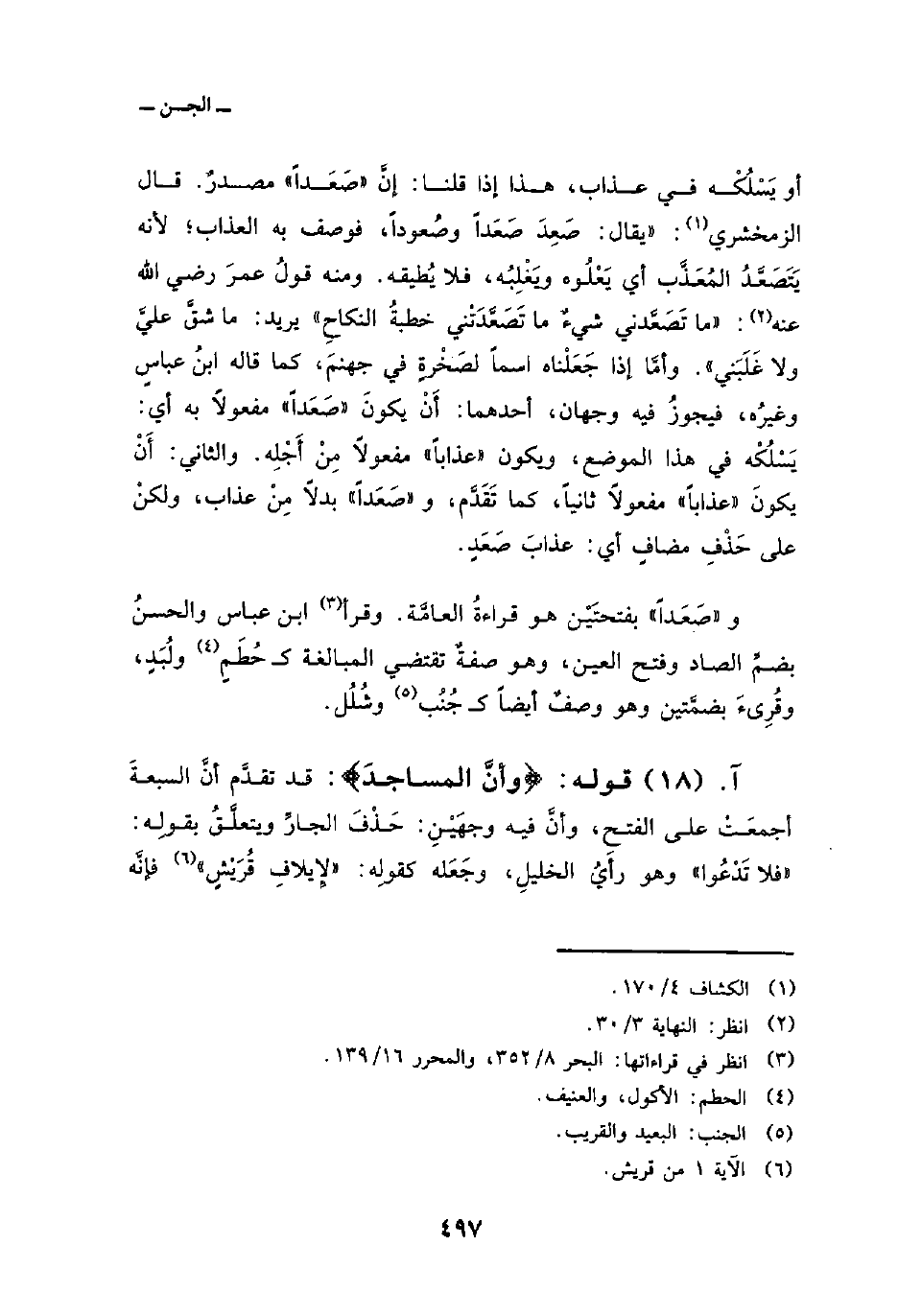 قوله: {وَأَنَّ المساجد} : قد تقدَّم أنَّ السبعةَ أجمعَتْ على الفتح، وأنَّ فيه وجهَيْنِ: حَذْفَ الجارِّ ويتعلَّقُ بقولِه: «فلا تَدْعُوا» وهو رأَيُ الخليلِ، وجَعَله كقولِه: {لإِيلاَفِ قُرَيْشٍ} [قريش: 1] فإنَّه