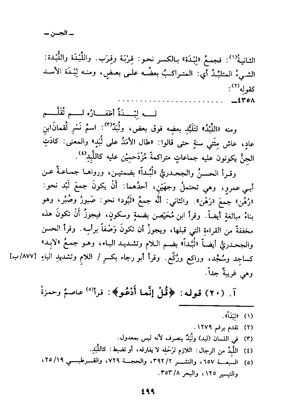 وقرأ الحسنُ والجحدريُّ «لُبُداً» بضمتين، ورواها جماعةٌ عن أبي عمروٍ، وهي تحتملُ وجهَيْنِ، أحدُهما: أَنْ يكونَ جمعَ لَبْد نحو: «رُهُن» جمعَ «رَهْن» . والثاني: أنَّه جمعُ «لَبُود» نحو: صَبورُ وصُبُر، وهو بناءُ مبالغةٍ أيضاً. وقرأ ابن مُحَيْصن بضمةٍ وسكونٍ، فيجوزُ أَنْ تكونَ هذه مخففةً من القراءةِ التي قبلها، ويجوزُ أن تكونَ وَصْفاً برأسِه. وقرأ الحسن والجحدريُّ أيضاً «لُبَّداً» بضم اللام وتشديد الباء، وهو جمعُ «لابِد» كساجِد وسُجَّد، وراكع ورُكَّع. وقرأ أبو رجاء بكسرِ/ اللامِ وتشديدِ الباءِ وهي غريبةٌ جداً.