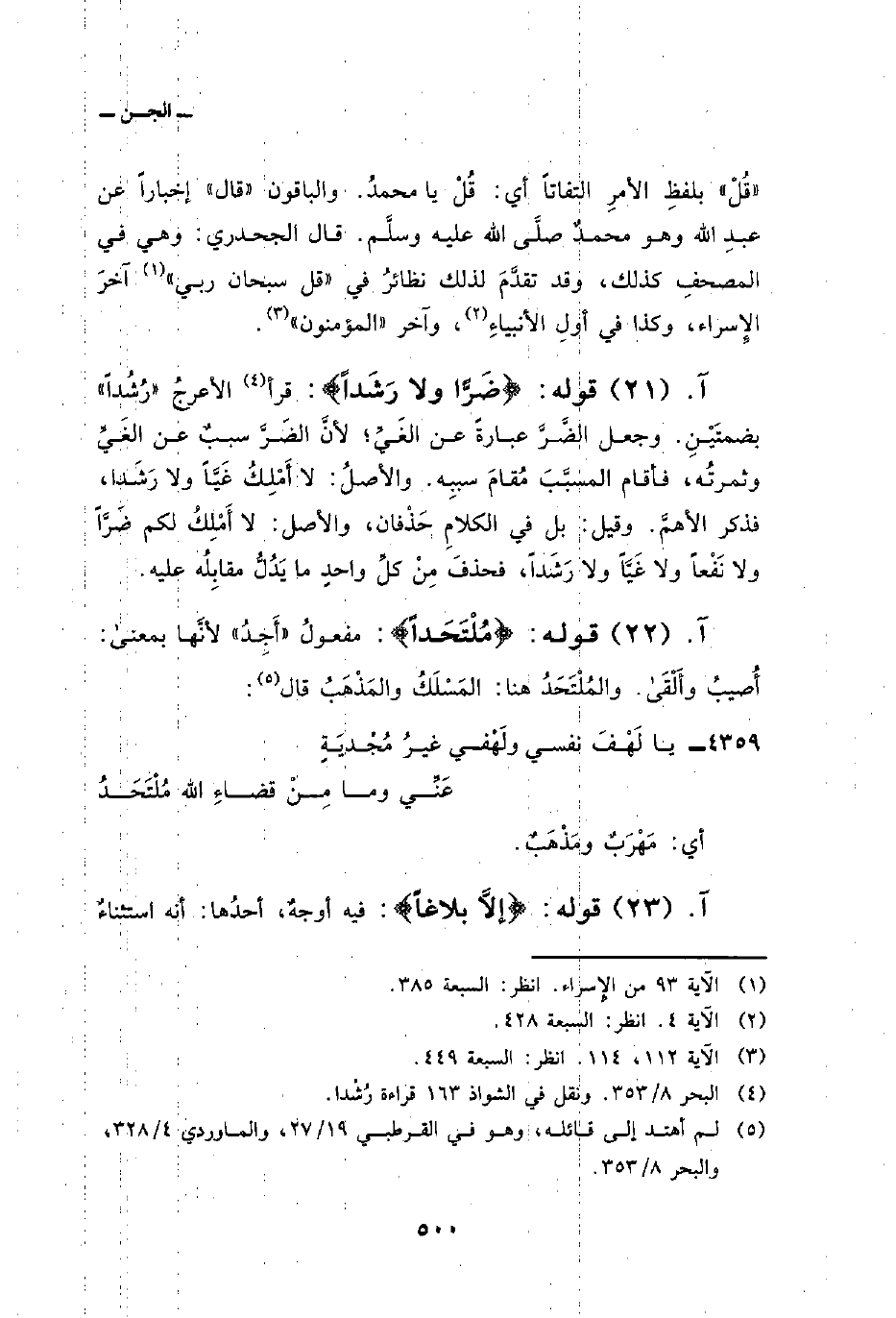 قوله: {ضَرّاً وَلاَ رَشَداً} : قرأ الأعرجُ «رُشُداً» بضمَتْينِ. وجعل الضَّرَّ عبارةً عن الغَيِّ؛ لأنَّ الضَرَّ سببٌ عن الغَيِّ وثمرتُه، فأقام المسبَّبَ مُقامَ سببِه. والأصلُ: لا أَمْلِكُ غَيَّاً ولا رَشَداً، فذكر الأهمَّ. وقيل: بل في الكلامِ حَذْفان، والأصل: لا أَمْلِكُ لكم ضَرَّاً ولا نَفْعاً ولا غَيَّاً ولا رَشَداً، فحذفَ مِنْ كلِّ واحدٍ ما يَدُلُّ مقابِلُه عليه.