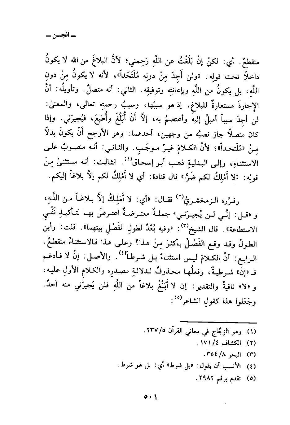 وقرَّره الزمخشريُّ فقال: «أي: لا أَمْلِكُ إلاَّ بلاغاً من اللَّهِ، و {قُلْ إِنِّي لَن يُجِيرَنِي} جملةٌ معترضةٌ اعترضَ بها لتأكيدِ نَفْيِ الاستطاعة» . قال الشيخ: «وفيه بُعْدٌ لطولِ الفَصْلِ بينهما» . قلت: وأين الطولُ وقد وقع الفَصْلُ بأكثرَ مِنْ هذا؟ وعلى هذا فالاستثناءُ منقطعٌ. الرابع: أنَّ الكلامَ ليس استثناءً بل شرطاً. والأصل: إنْ لا فأدغم ف «إنْ» شرطيةٌ، وفعلُها محذوفٌ لدلالةِ مصدرِه والكلامِ الأولِ عليه، و «لا» نافيةٌ والتقدير: إن لا أُبَلِّغْ بلاغاً من اللَّهِ فلن يُجيرَني منه أحدٌ. وجَعَلوا هذا كقولِ الشاعر: