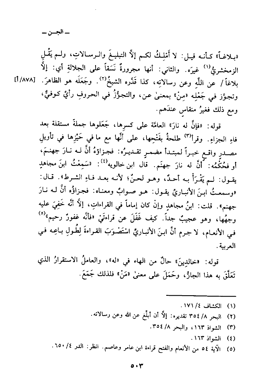 وجَعَلَه هو الظاهرَ. وتجوَّز في جَعْلِه «مِنْ» بمعنى عن، والتجوُّزُ في الحروفِ رأيٌ كوفيٌّ، ومع ذلك فغيرُ منقاسٍ عندَهم.