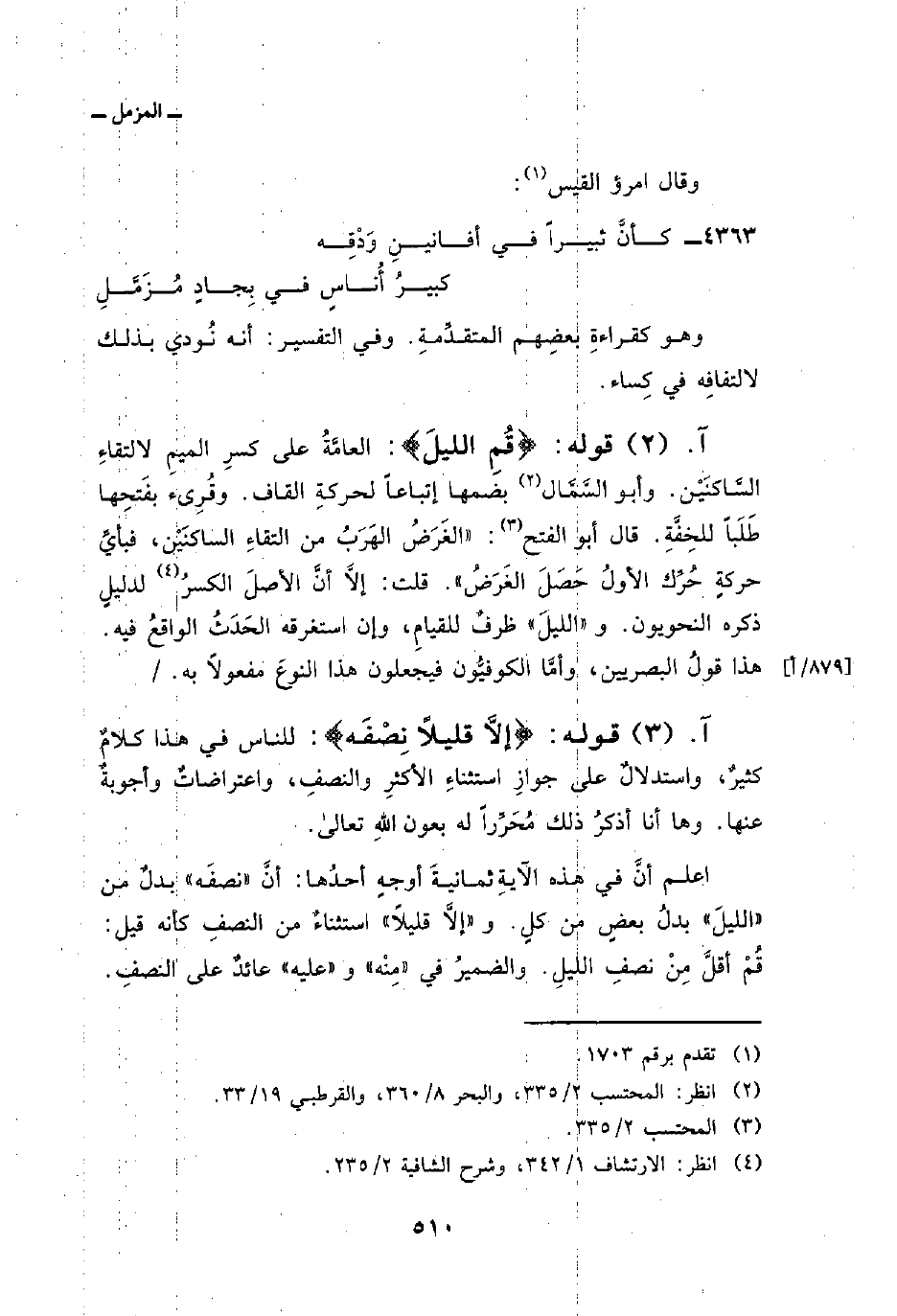 قوله: {المزمل} : أصلُه المتزَمِّلُ، فأُدْغِمَت التاءُ في الزاي يقال: تَزَمَّل يتزَمَّلُ تَزَمُّلاً. فإذا أُريد الإِدغامُ اجْتُلِبَتْ همزةُ الوصلِ، وبهذا الأصلِ قرأ أُبيُّ بن كعب. وقرأ عكرمةُ «المُزَمِّل» بتخفيفِ الزايِ وتشديدِ الميمِ، اسمَ فاعلٍ، على هذا فيكونُ فيه وجهان، أحدُهما: أنَّ أصلَه المُزْتَمِلُ على مُفْتَعِل فأُبْدِلَتِ التاءُ ميماً وأُدْغِمَتْ، قاله أبو البقاء، وهو ضعيفٌ. والثاني: أنَّه اسمُ فاعلٍ مِنْ زَمَّل مشدداً، وعلى هذا فيكون المفعولُ محذوفاً، أي: المُزَمِّل جِسْمَه. وقُرِىء كذلك، إلاَّ أنَّه بفتحِ الميمِ اسمَ مفعولٍ منه، أي: المُلَفَّف. والتَّزَمُّلُ: التَّلَفُّفُ. يقال: تَزَمَّلَ زيدٌ بكساءٍ، أي: التفَّ به قال ذو الرَّمة: